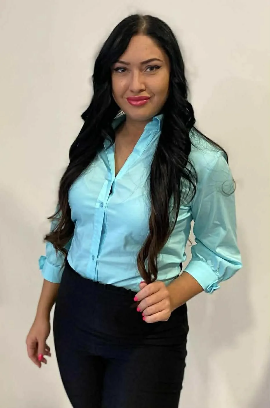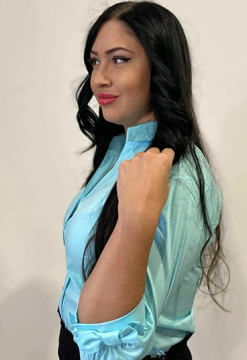 Elasztikus anyagú V kivágott,galléros nyakkal,gombos záródással,masni díszítéssel ujján.