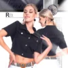 Elasztikus anyagból készült rövid fazonú álzsebes blézer válltöméssel és díszgombokkal.