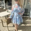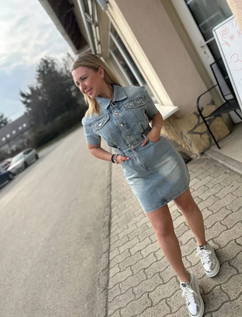 Ez a kényelmes farmer ruha tökéletes választás a mindennapokra. Oldalzsebekkel és gyöngy díszítéssel a felső zsebeken.