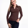 Elasztikus anyagból készült emelt nyakú felső, aszimmetrikus elejemegoldással, kis fém márkajelzéssel.