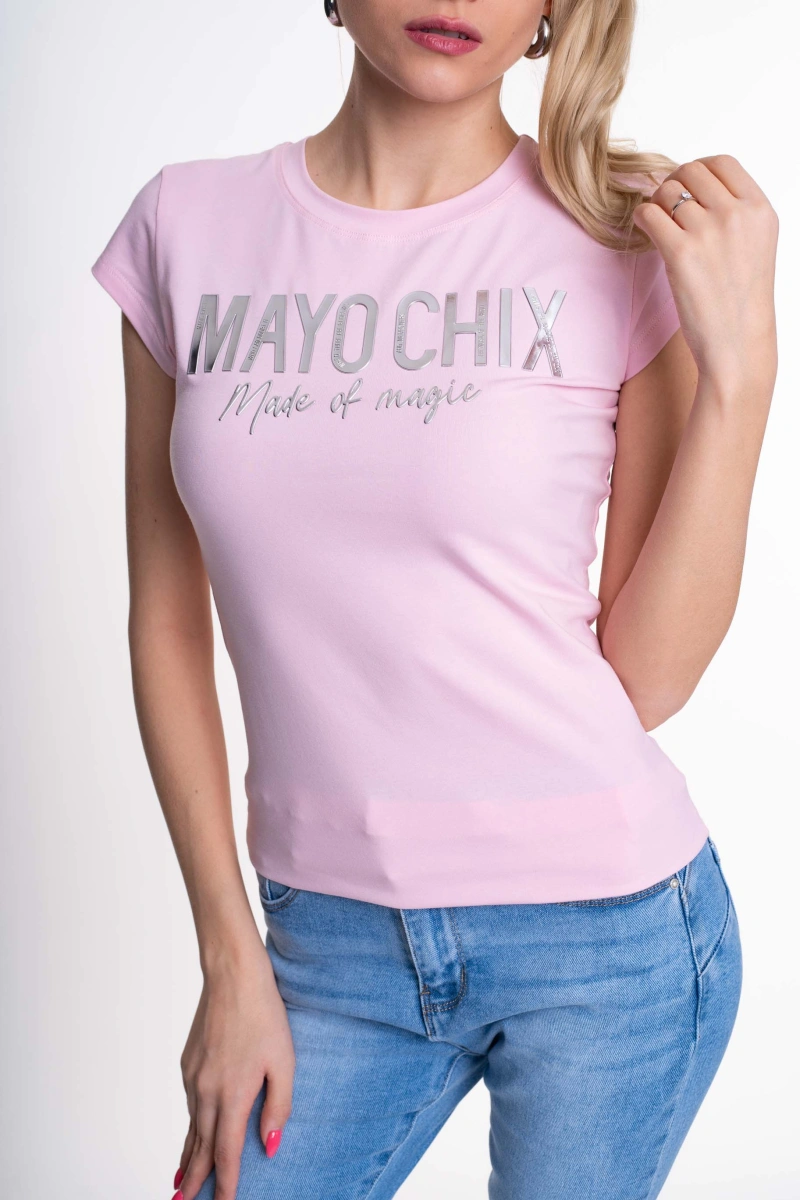 Elasztikus pamut anyagból készült sportos fazonú felső, domború matrica díszítéssel.