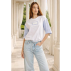Mályva színű, 3-D mintás Magenta felső, szűk fazonú, mély nyakkivágással, 3/4 ujjhosszal, nyakán és ujján csipke díszítéssel. Hátul rávarrt fém Magenta márkajelzés.