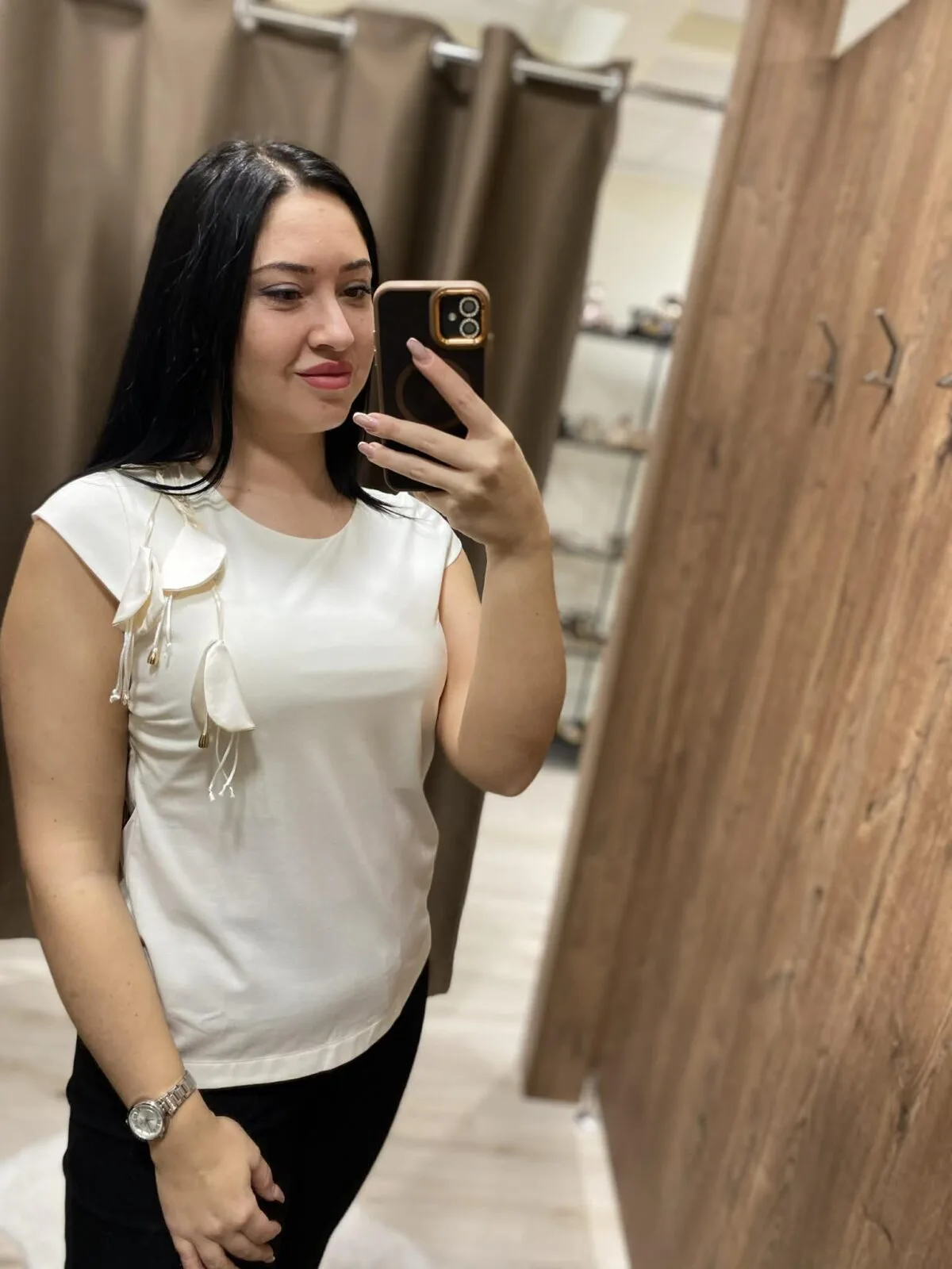 Vaj színű, enyhén elasztikus Magenta felső, laza fazonú, ujjatlan, kerek nyakkivágással, elején virágos díszítéssel, hátul gombos záródással. Hátul rávarrt fém Magenta márkajelzés.
