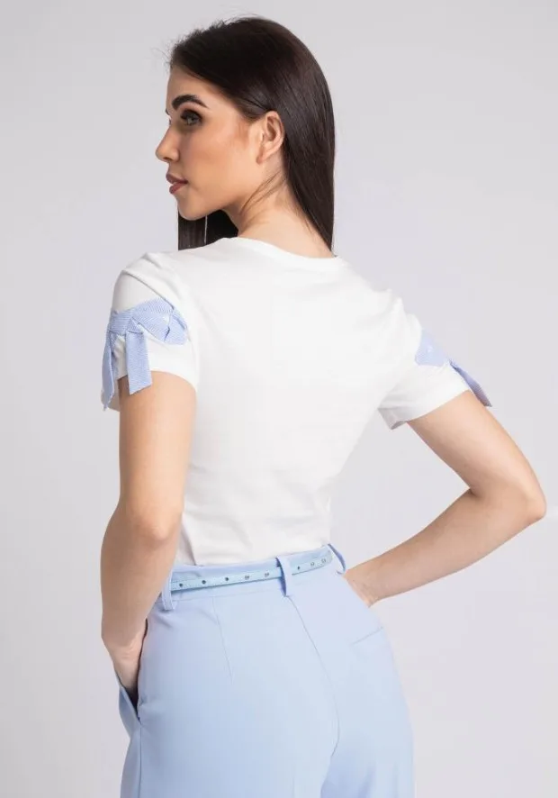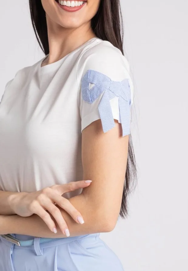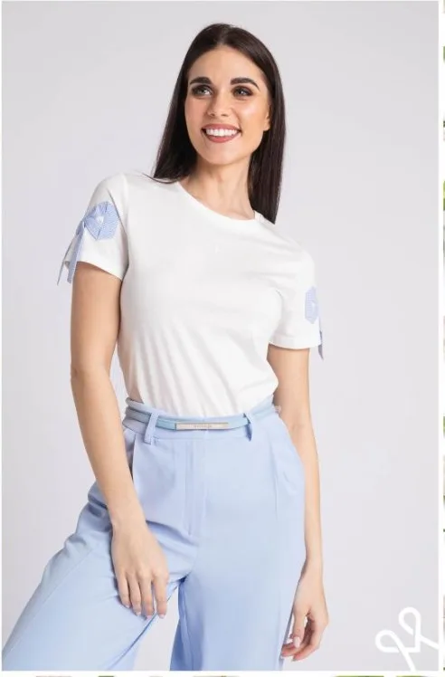 Vaj színű, elasztikus Magenta felső, szűkebb fazonú, kerek nyakkivágással, ujján masni díszítéssel. Hátul filmnyomott Magenta márkajelzés.