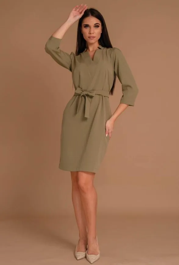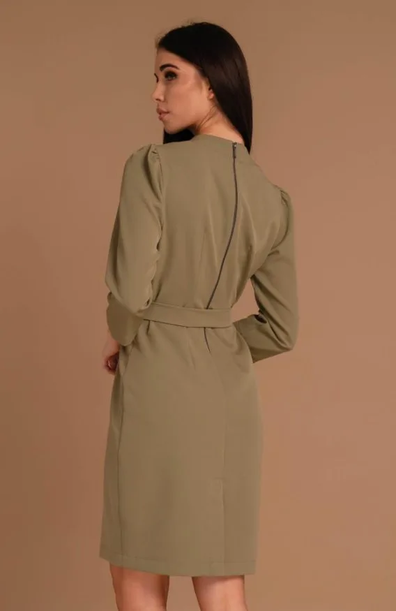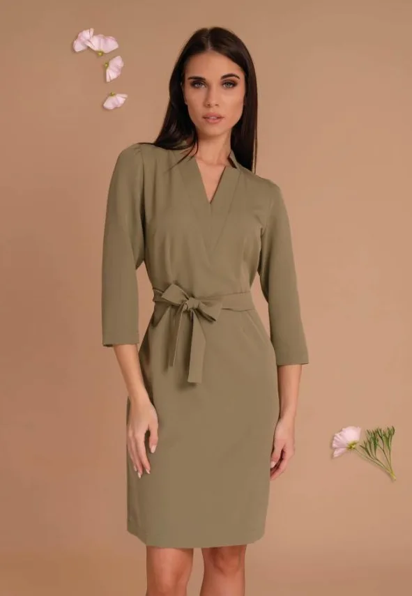 Khaki színű, Magenta ruha, laza fazonú, elején V-nyakkivágással, 3/4-es ujjhosszal, derékrészen saját anyagából megkötővel, térd fölé érő hosszal, hátul zippzáras záródással. Ujján rávarrt fém Magenta márkajelzés.