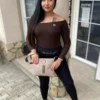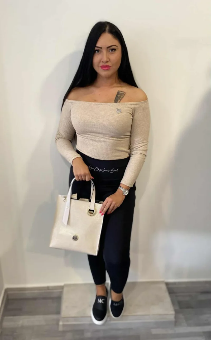 Elasztikus, bordás kötött anyagból készült csónak nyakú póló, strasszos matricanyomott márkajelzéssel.