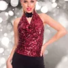 Elasztikus, flitteres anyagból készült rövid fazonú, bélelt felső.