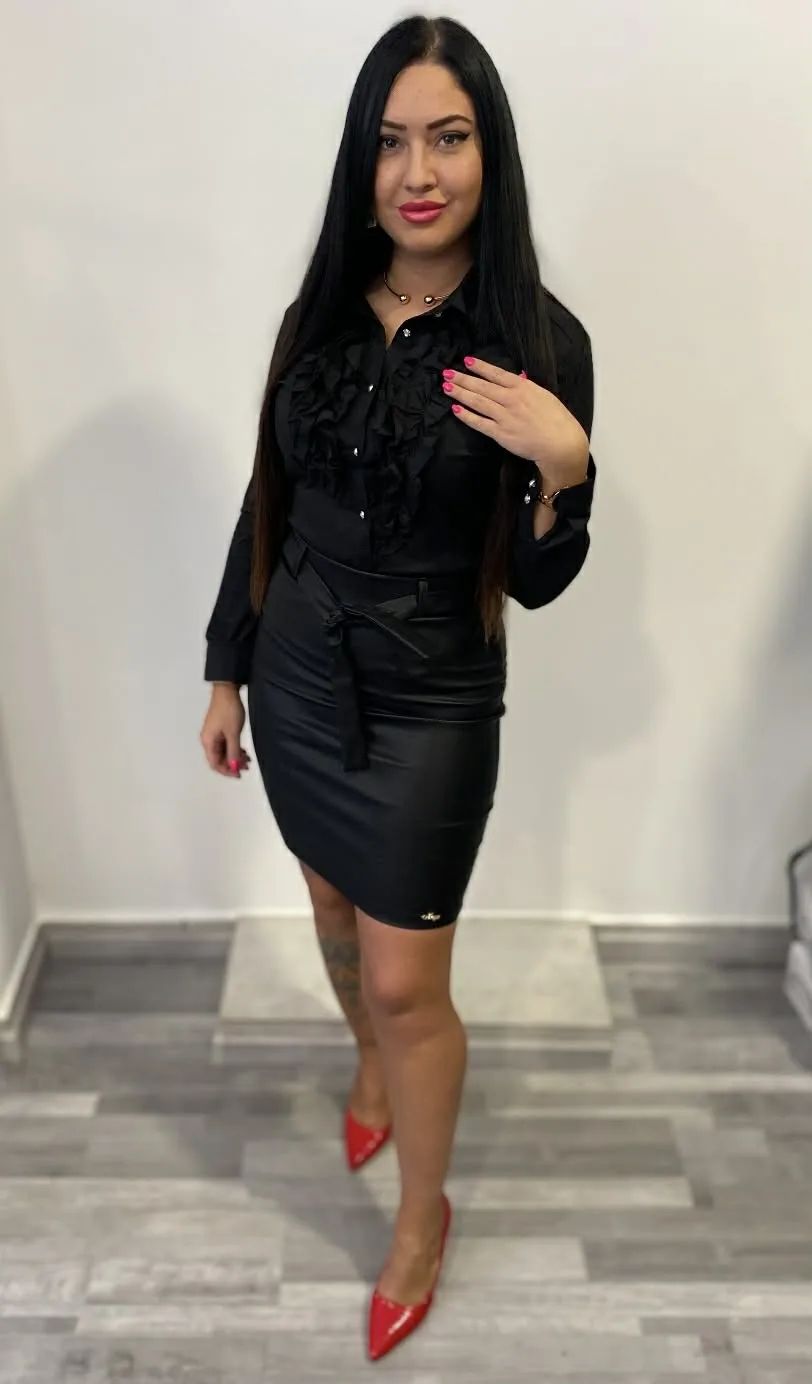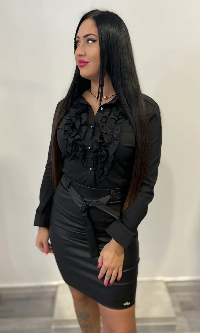 Elasztikus puplin anyagból készült, karcsúsított fazonú blúz, gombos záródással, fodros díszítéssel.