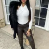 Elasztikus anyagból készült felső, aszimmetrikus dekoltázsú, bélelt mellréssszel, fém díszítéssel és márkajelzéssel.