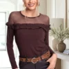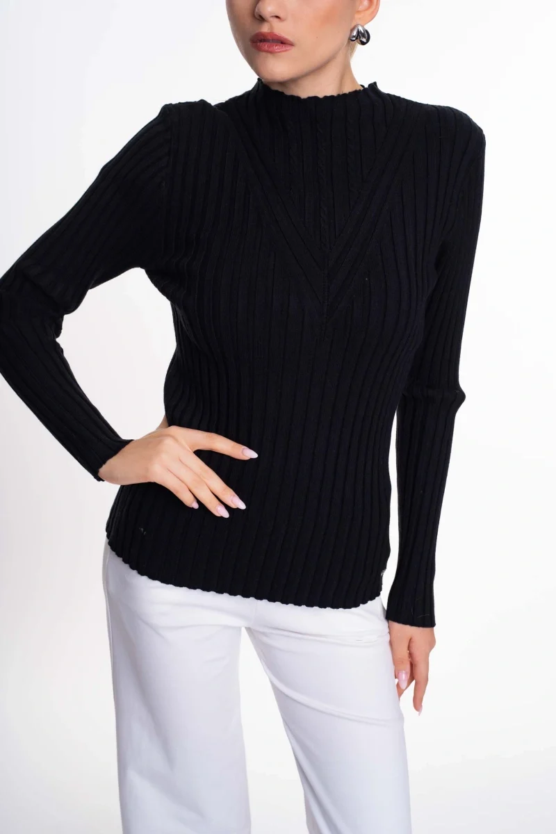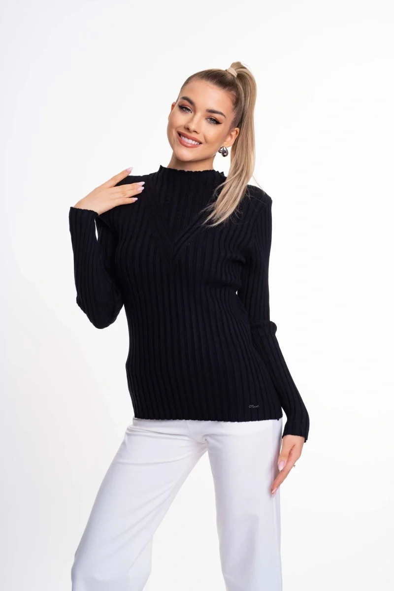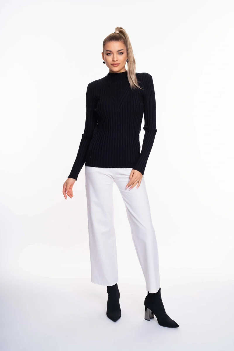 Elasztikus, bordás kötött anyagú pulóvel emelt nyakrésszel, anyagában kötött mintával, kis fém márkajelzéssel.