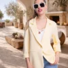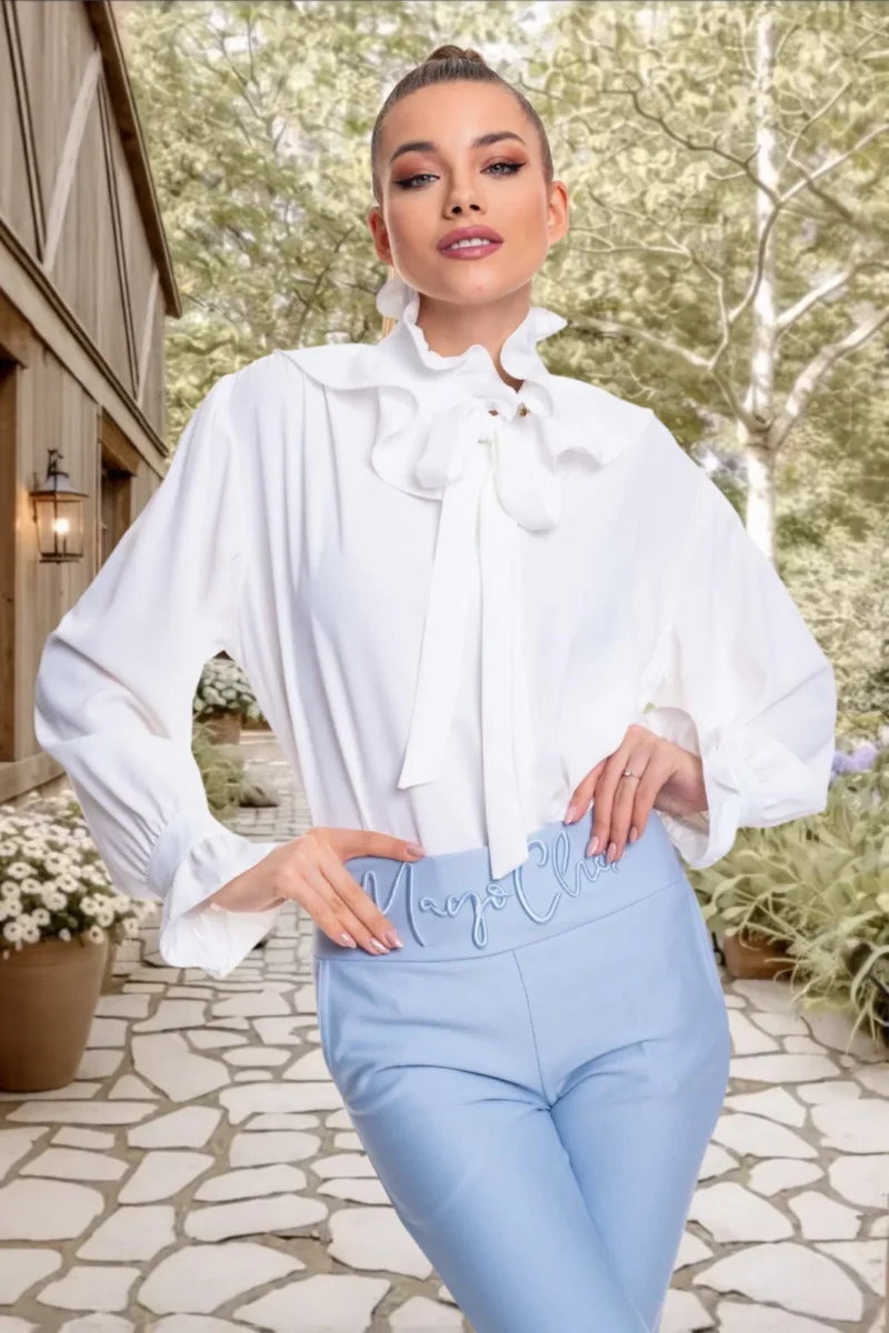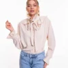 Enyhén elasztikus, könnyed anyagból készült, lezser szabásvonalú blúz, fodrokkal gazdagon díszített emelt nyakrésszel és megkötővel, kis fém márkajelzéssel.
