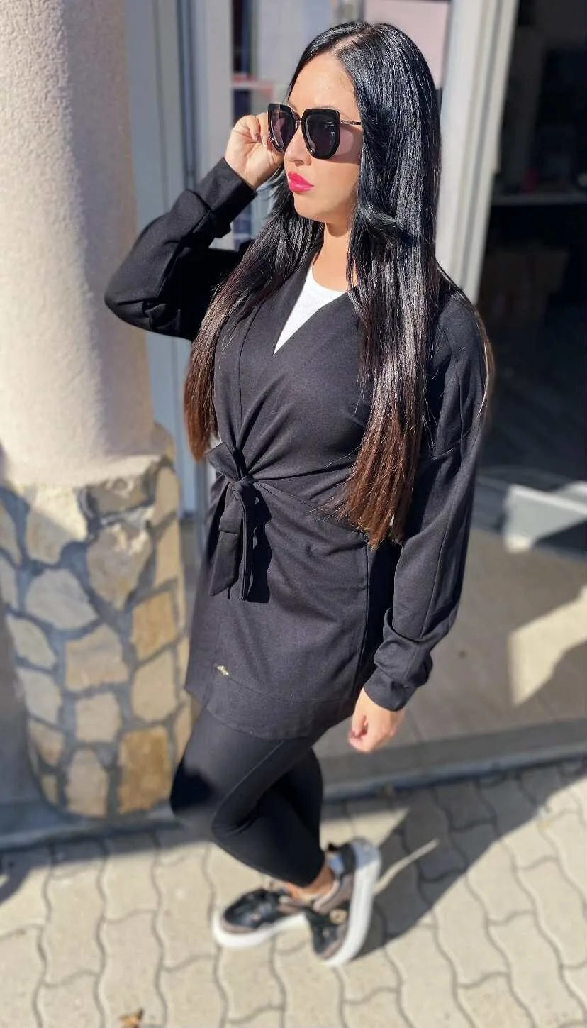 Elasztikus anyagból készült nyitott kardigán, derekán saját anyagából készült megkötővel.