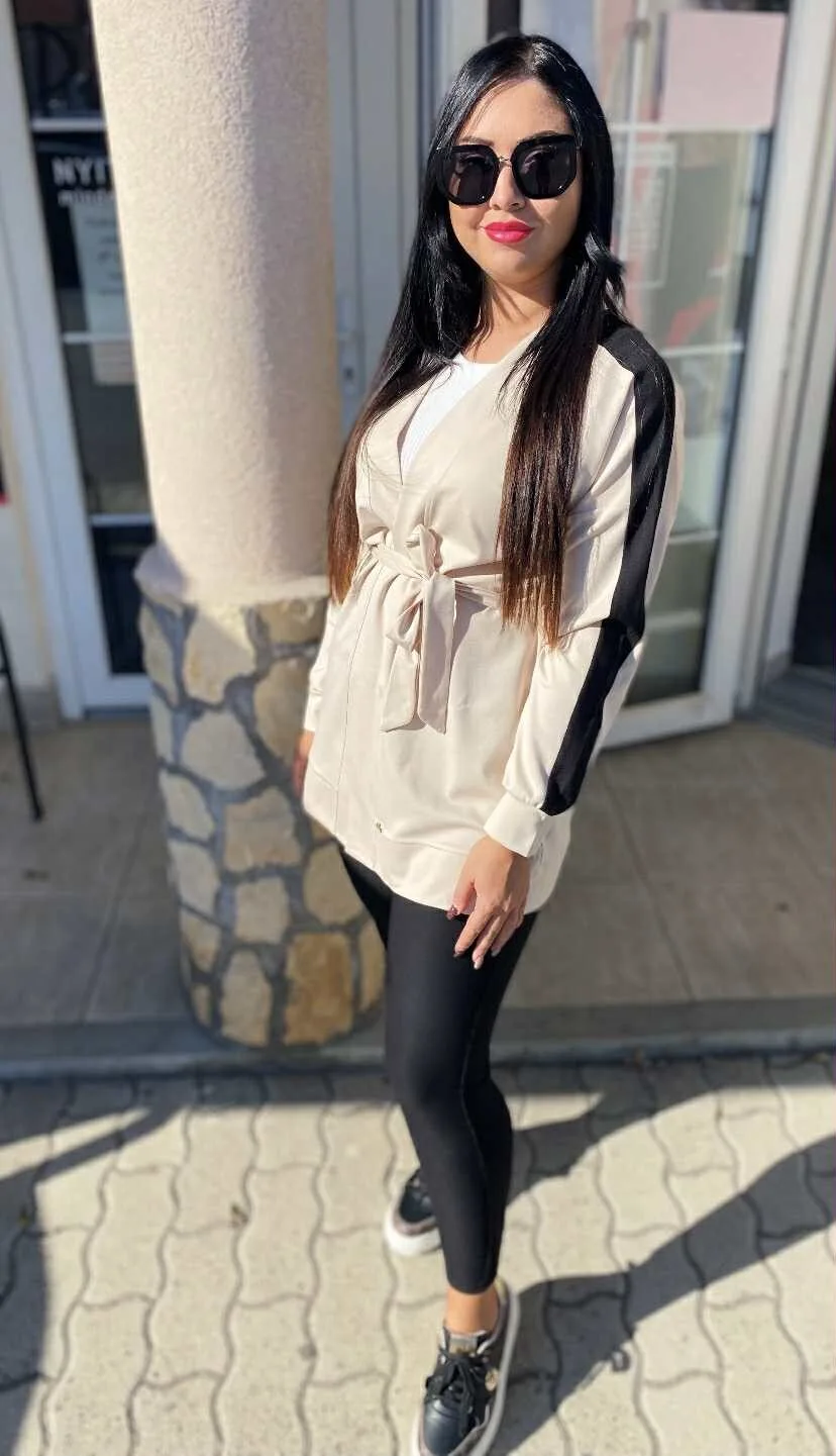 Elasztikus anyagból készült nyitott kardigán, derekán saját anyagából készült megkötővel, matrica nyomott díszítéssel.