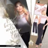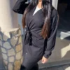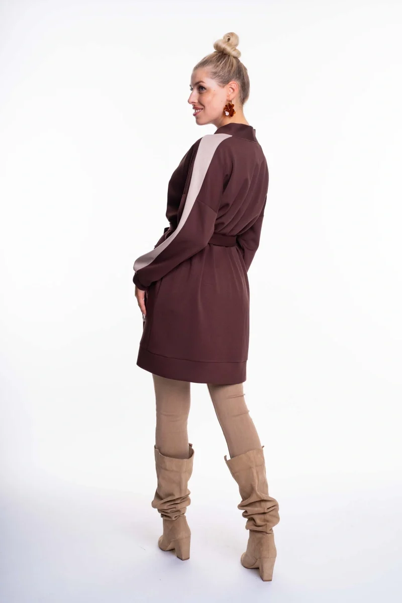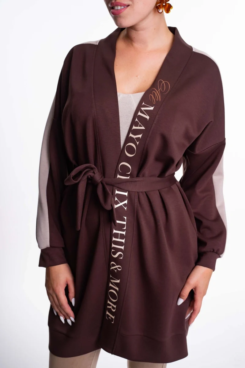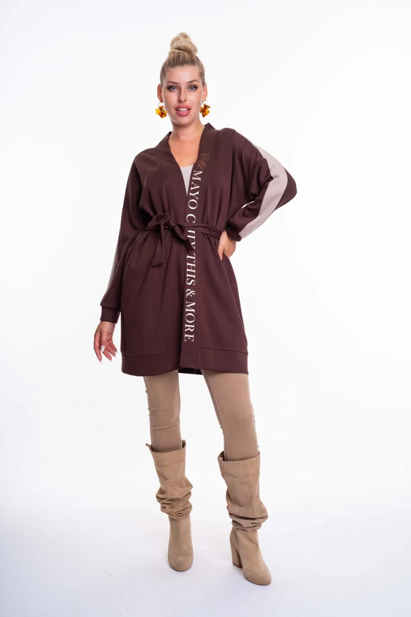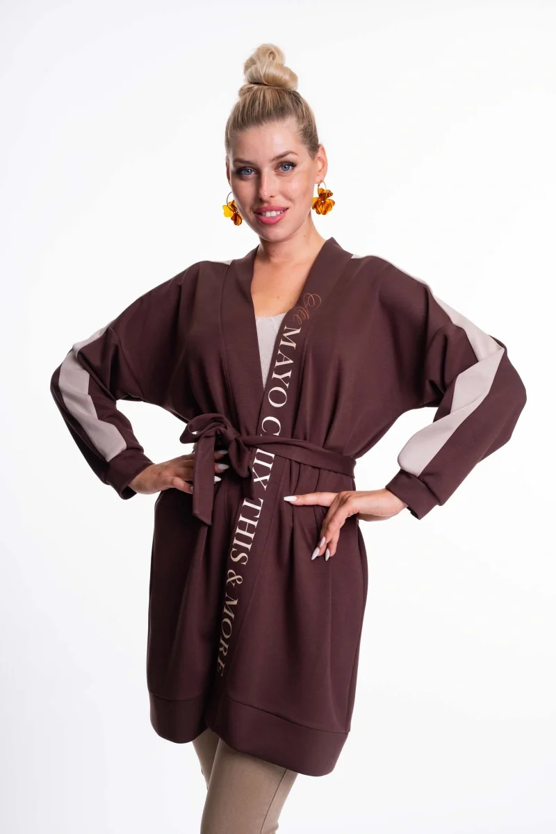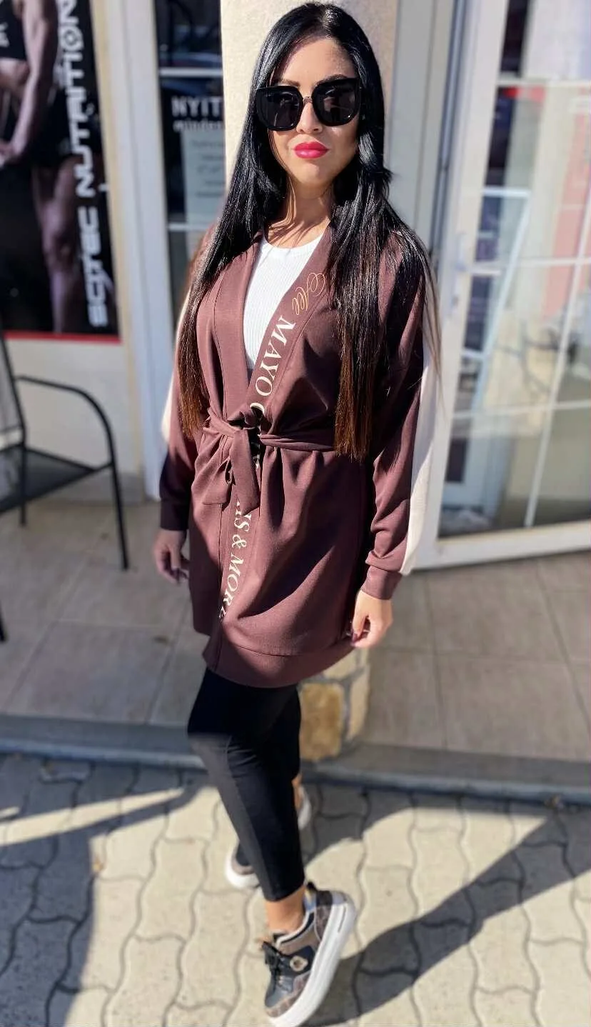 Elasztikus anyagból készült nyitott kardigán, derekán saját anyagából készült megkötővel, matrica nyomott díszítéssel.
