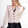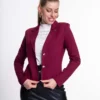 Elasztikus anyagból készült karcsúsított fazonú blézer válltöméssel, dísszegőkkel, gombos záródással, kis fém márkajelzéssel.