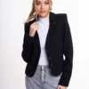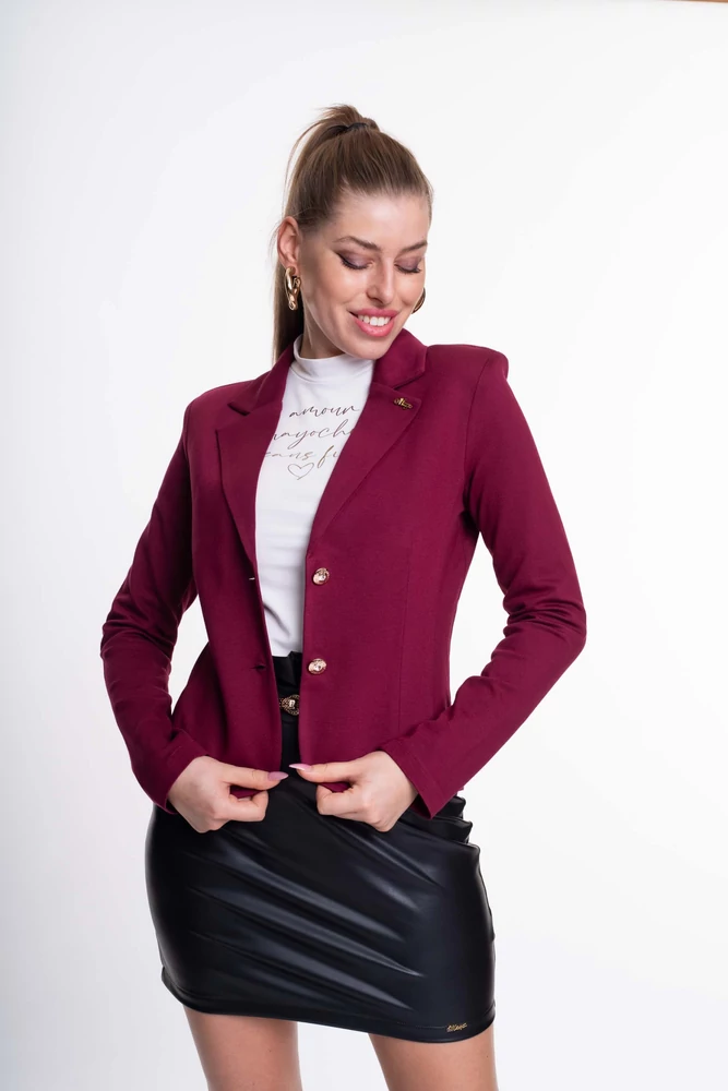 Elasztikus anyagból készült karcsúsított fazonú blézer válltöméssel, dísszegőkkel, gombos záródással, kis fém márkajelzéssel.