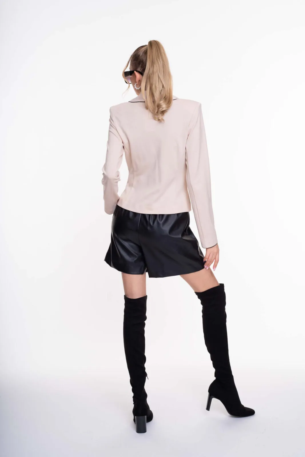 Elasztikus anyagból készült karcsúsított fazonú blézer válltöméssel, dísszegőkkel, gombos záródással, kis fém márkajelzéssel.