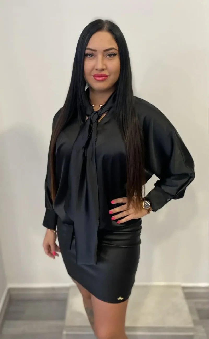 Fix szatén anyagból készült, lezser szabásvonalú, ejtett vállú blúz, gumírozott aljarésszel, nyakrészen megkötővel és kis fém márkajelzéssel.