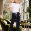 Elasztikus anyagból készült nadrág fodros díszítésű zsebekkel, öv kiegészítővel, mosáshoz levehető kis fém márkajelzéssel.