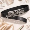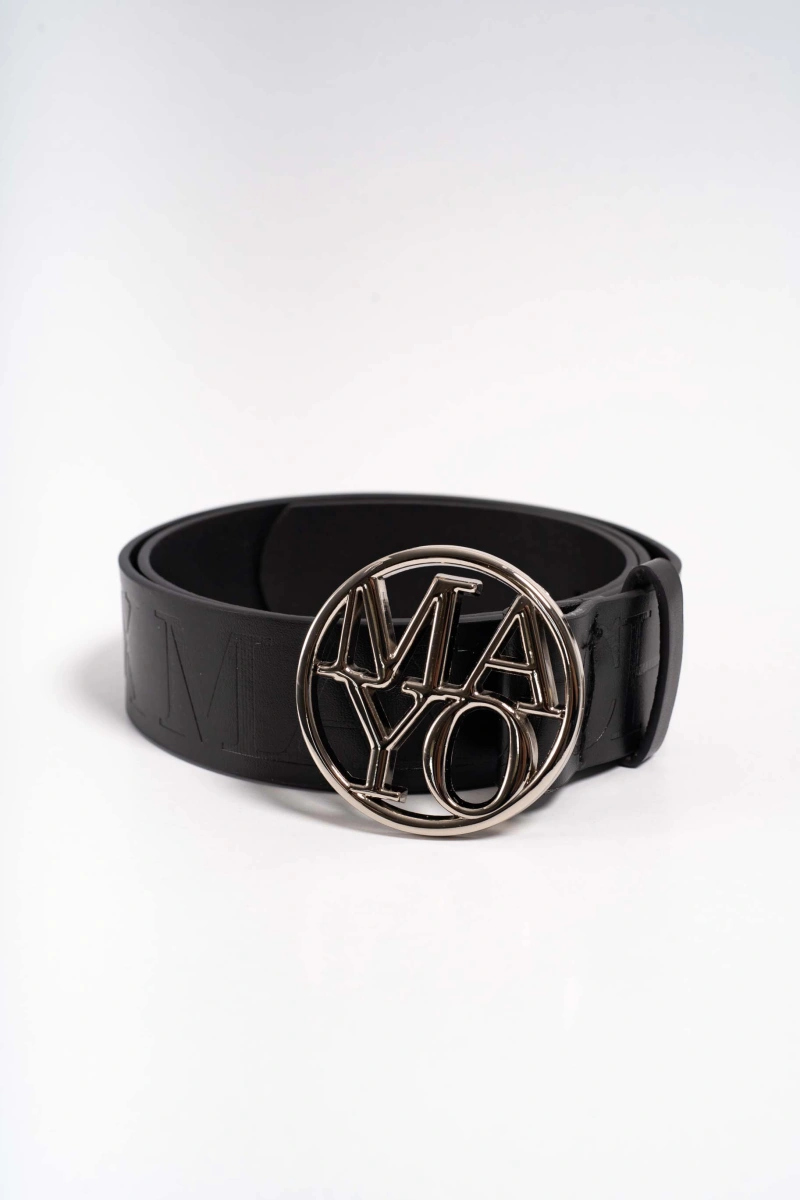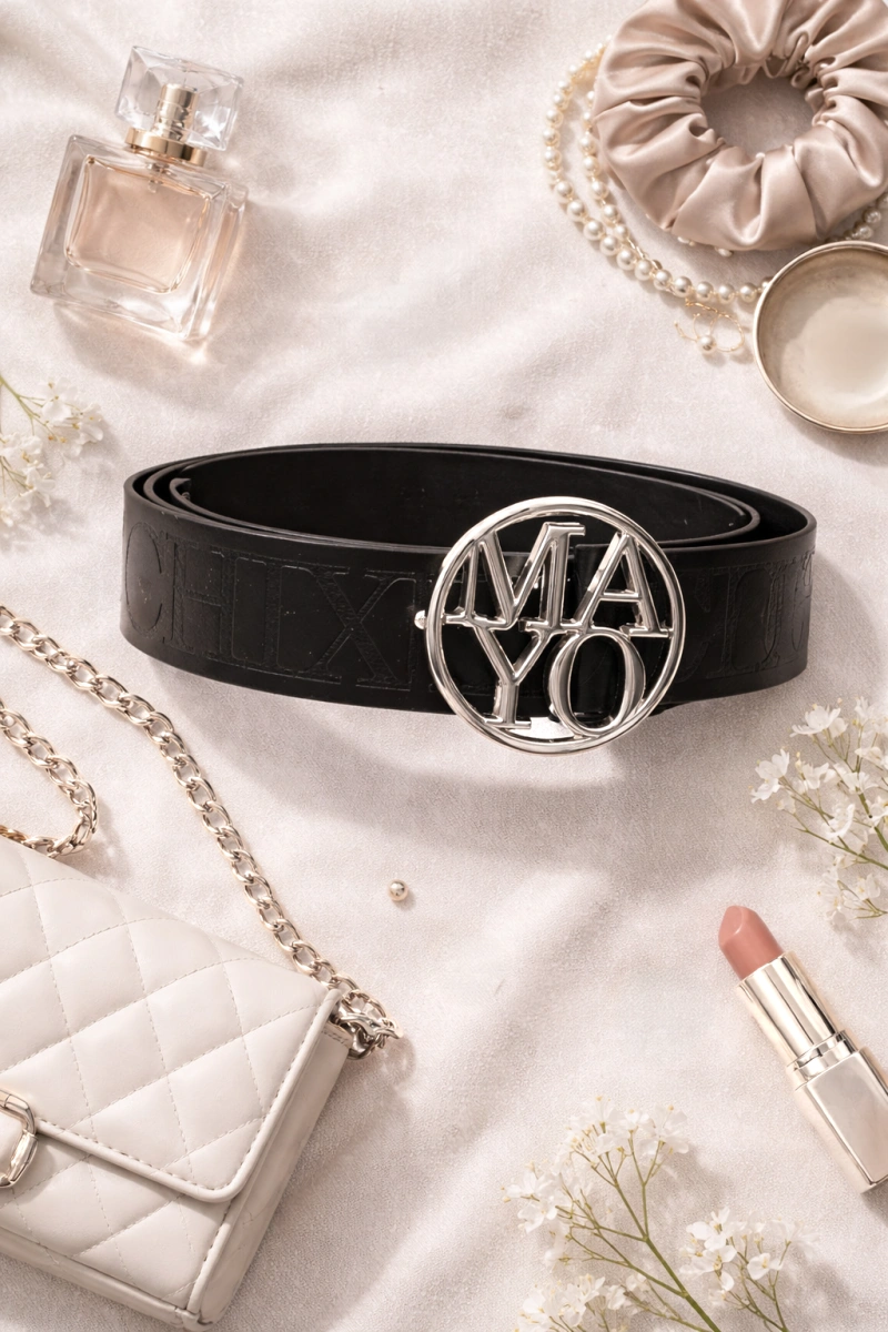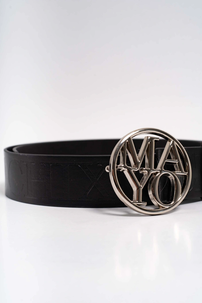 Matt műbőr öv dombornyomással, kerek ezüst színű csattal.