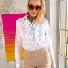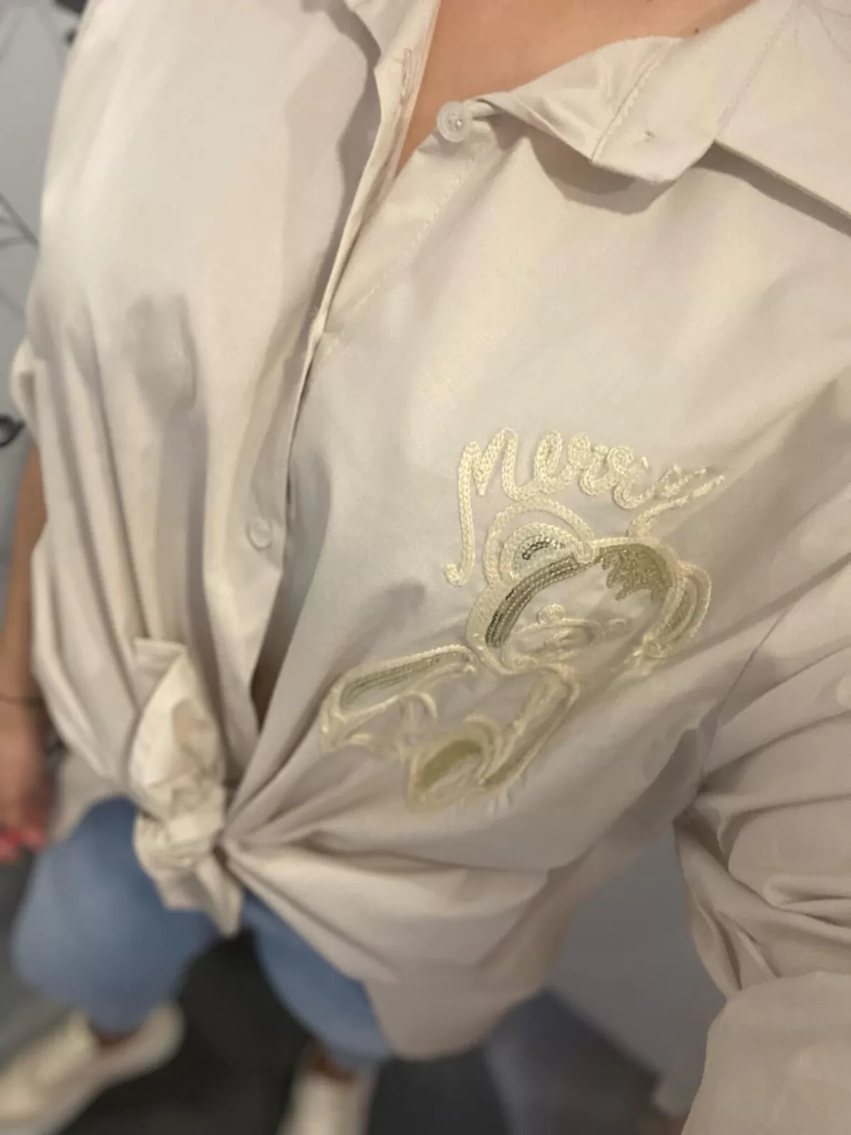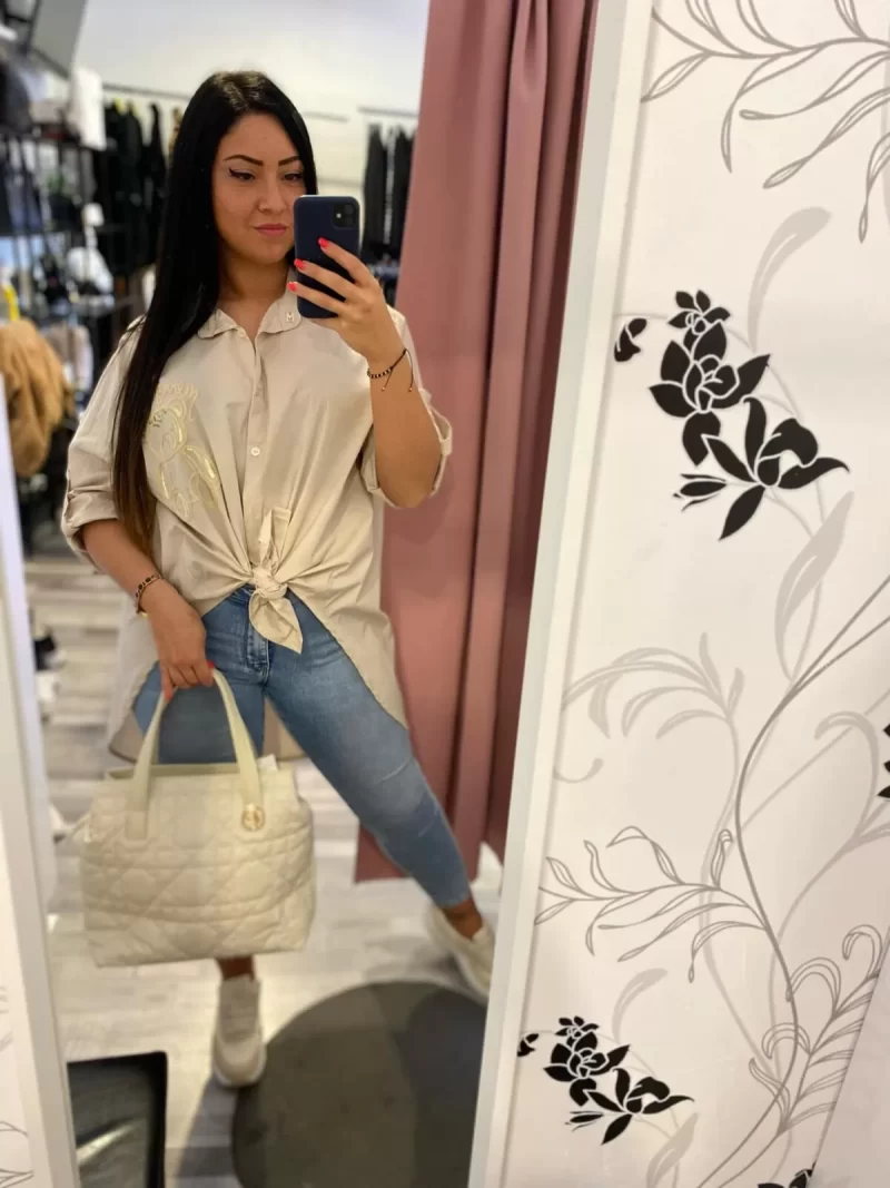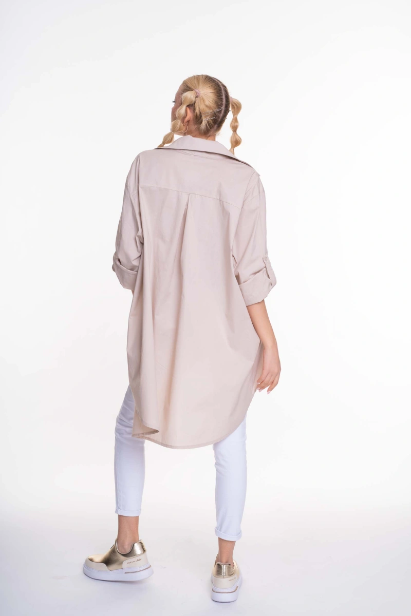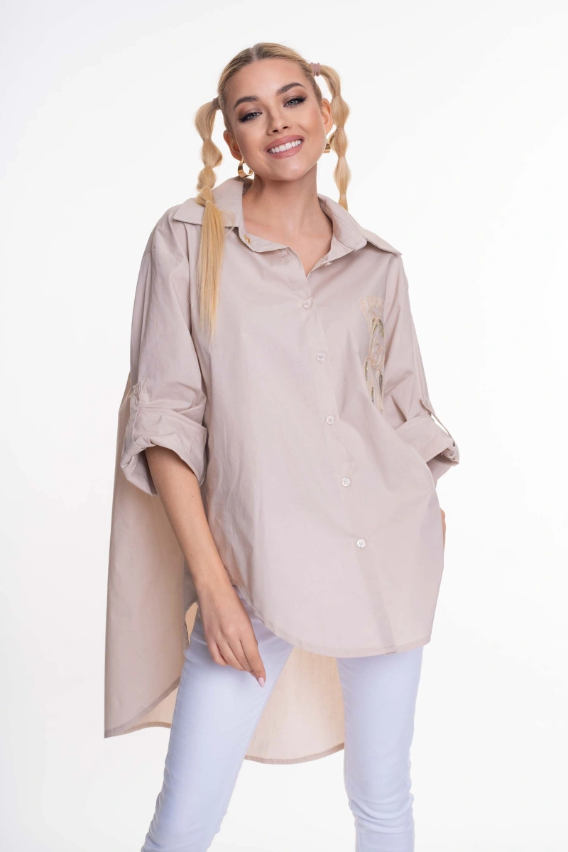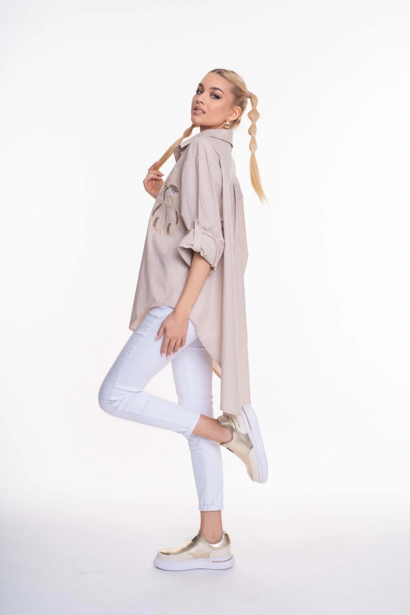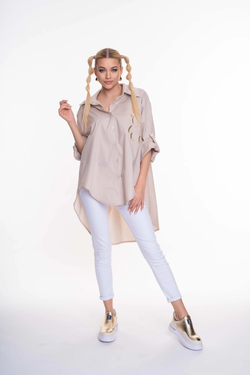 Fix anyagból készült, oversize tunika, gombos záródással, flitteres díszítéssel.