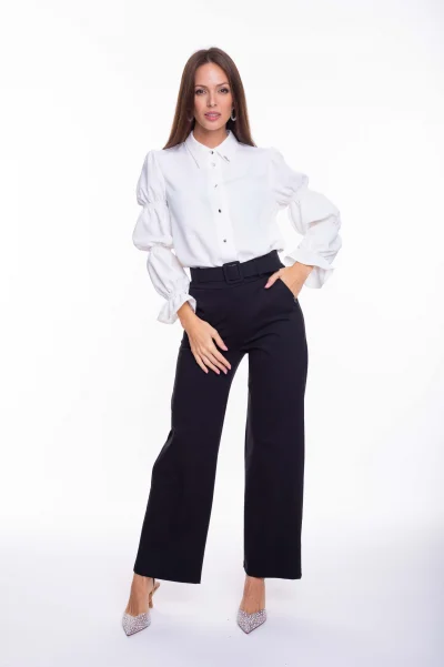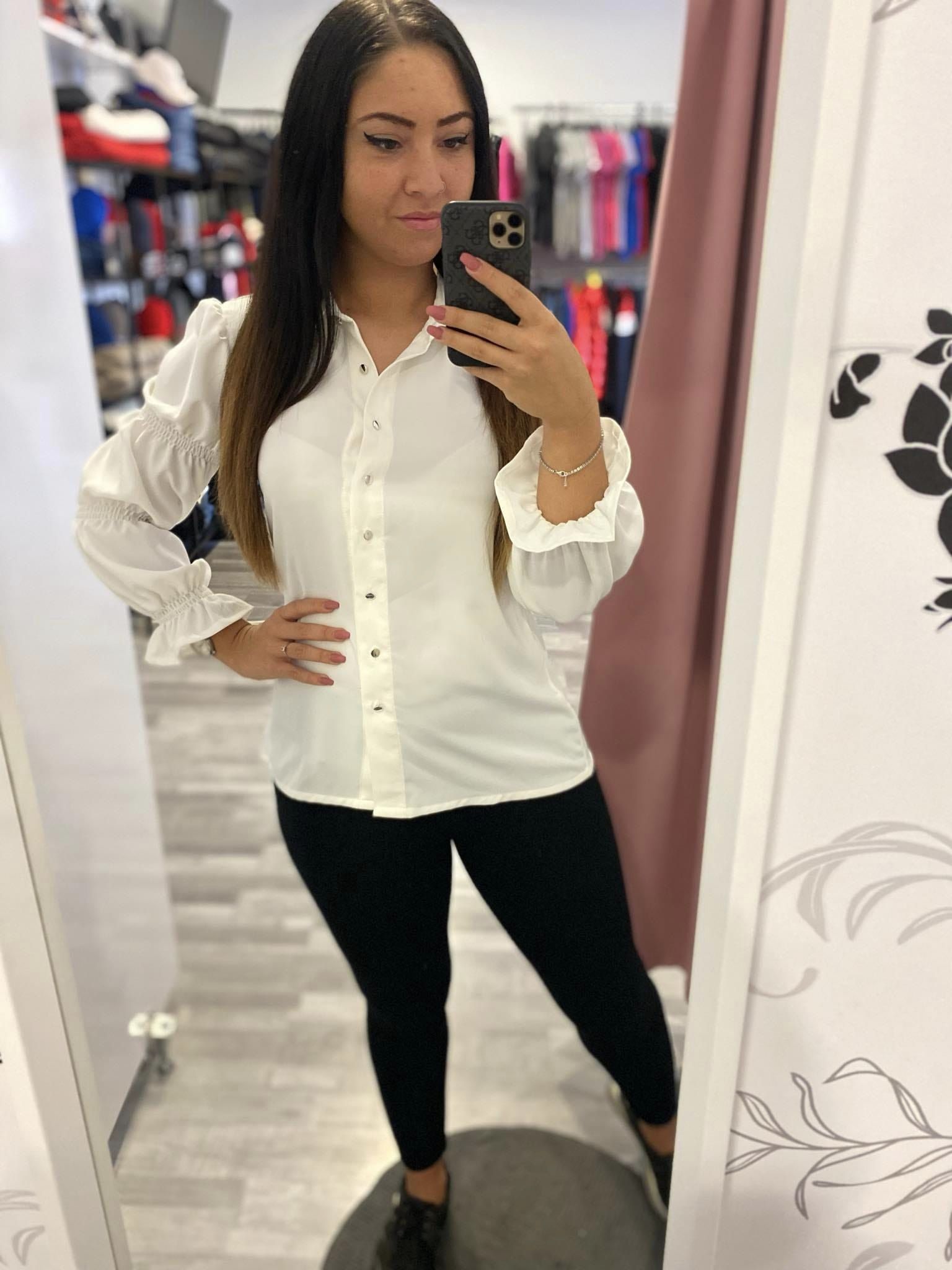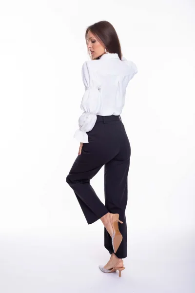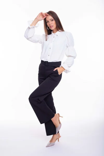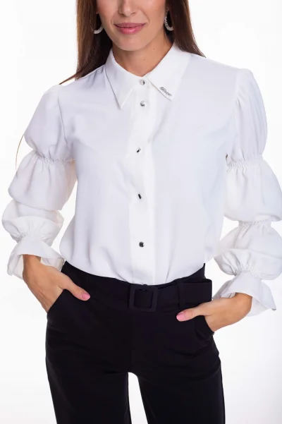 Enyhén elasztikus, könnyed anyagból készült blúz gombos záródásal, ujjain gumírozott díszítéssel, gallérján kis fém márkajelzéssel.