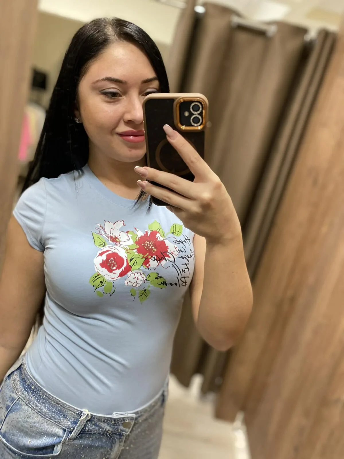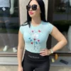 Elasztikus pamut anyagból készült, sportos fazonú felső, fényes, domború matricanyomással díszítve.