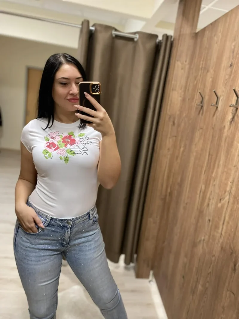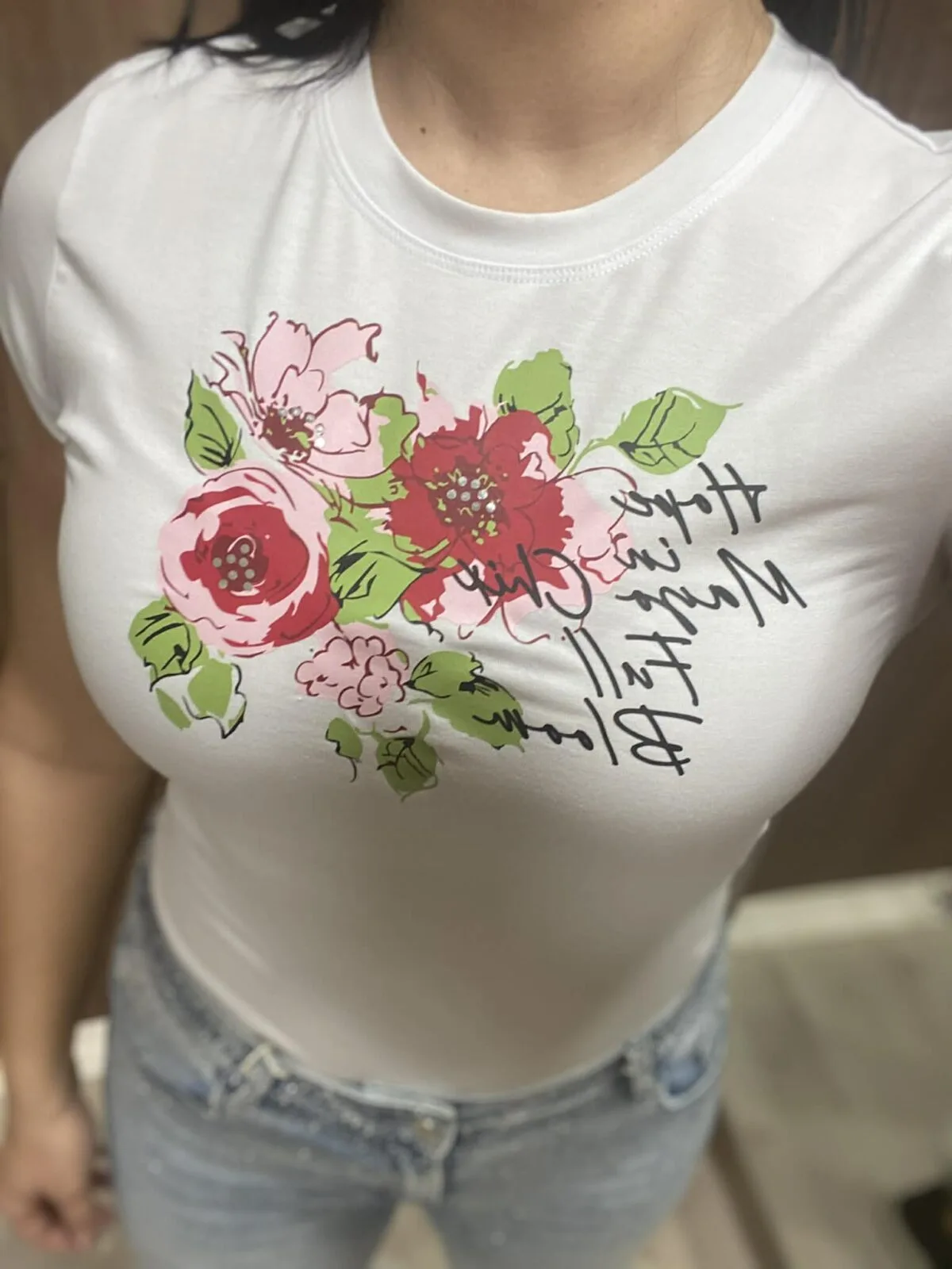 Elasztikus pamut anyagból készült, sportos fazonú felső, fényes, domború matricanyomással díszítve.