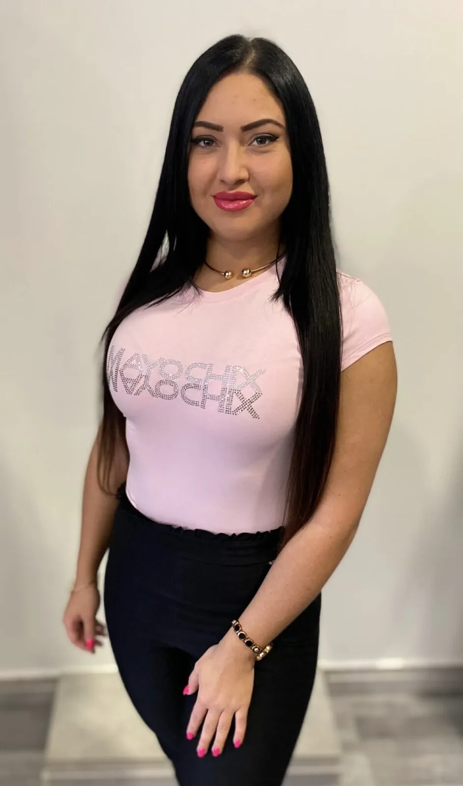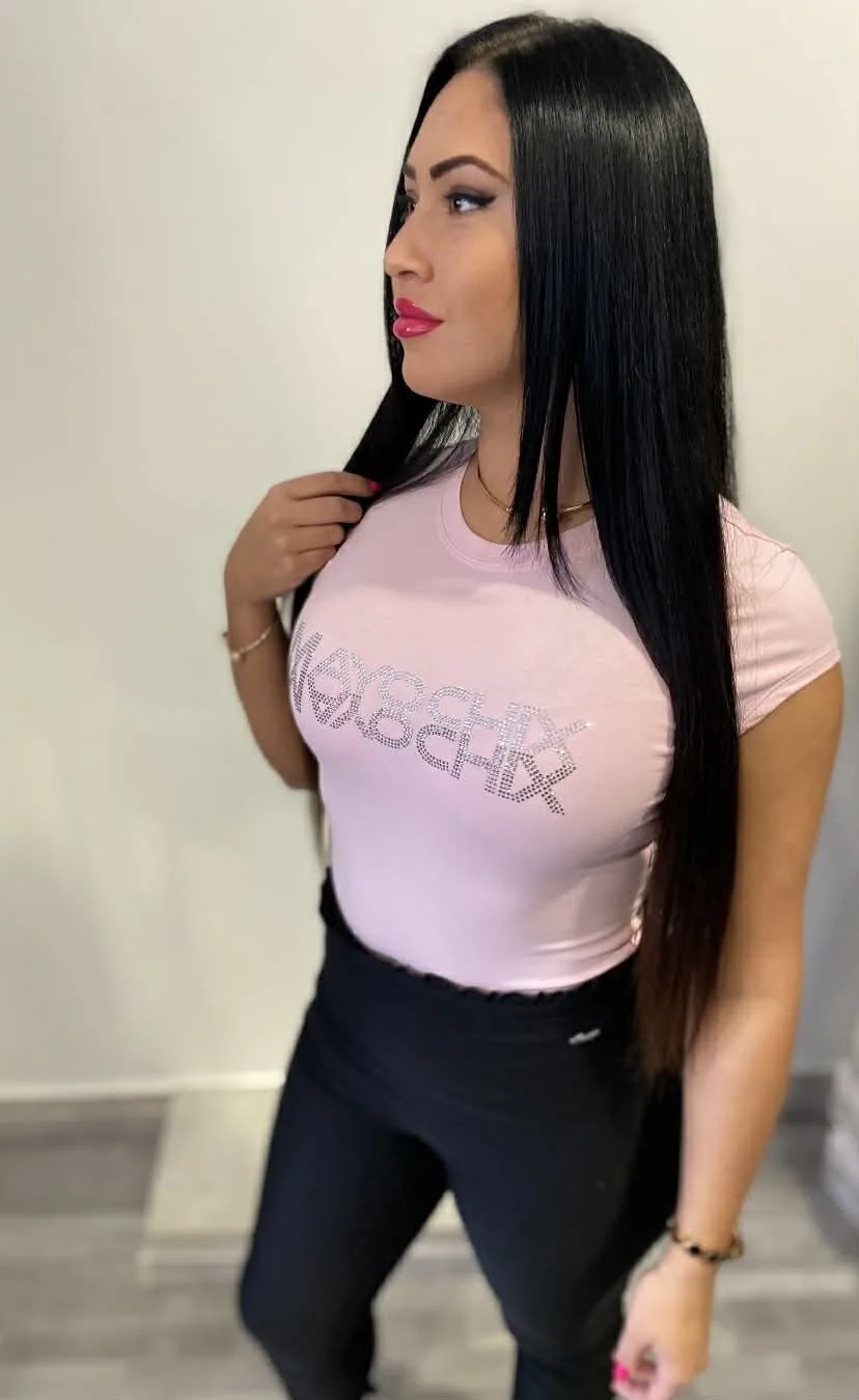 Elasztikus pamut anyagból készült sportos fazonú felső,  strasszköves díszítéssel.