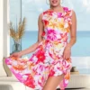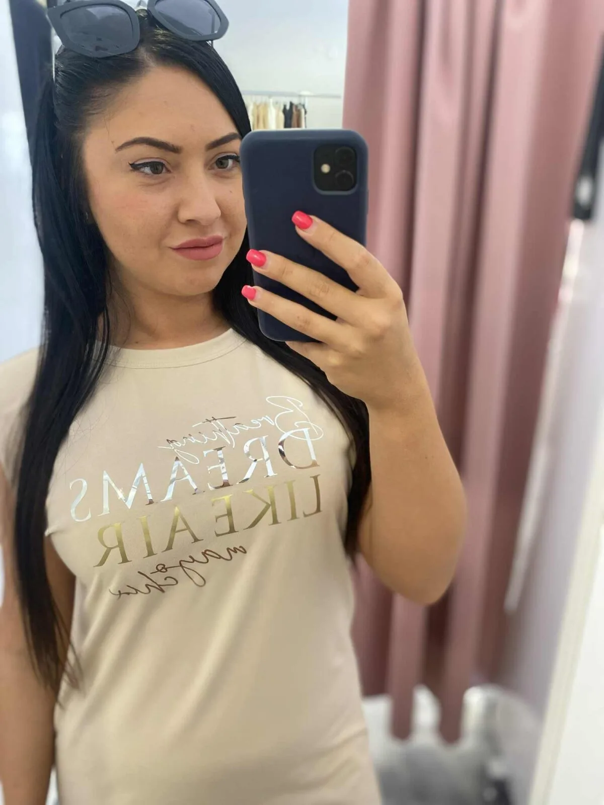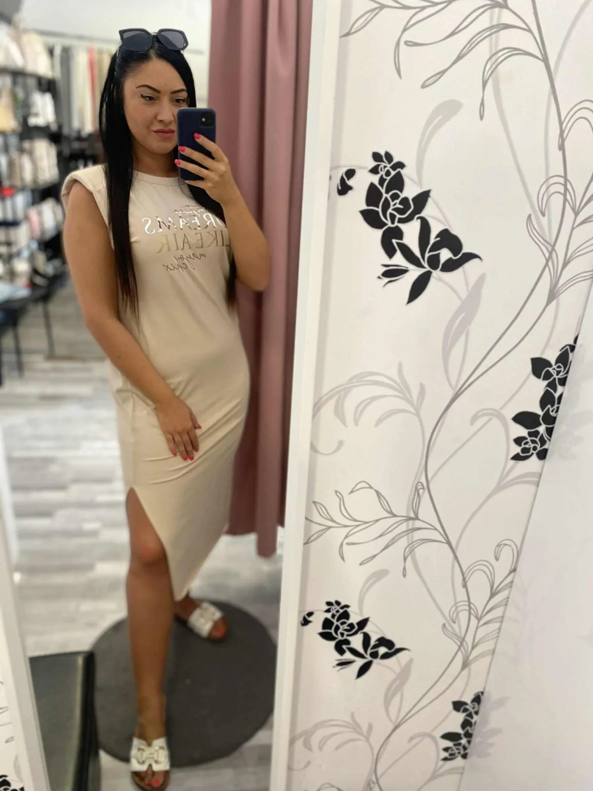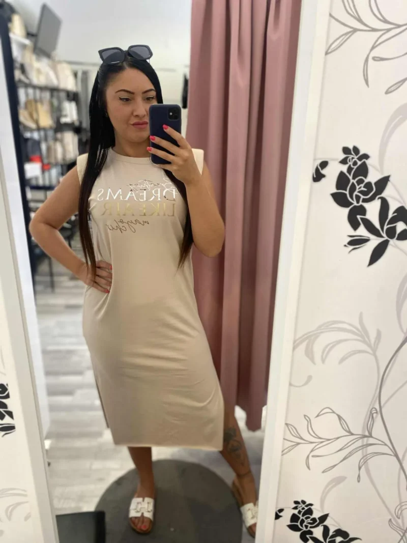 Elasztikus anyagból készült egyenes vonalú lezser ruha válltöméssel, matrica nyomott díszítéssel, szegetlen aljarésszel.