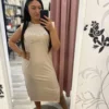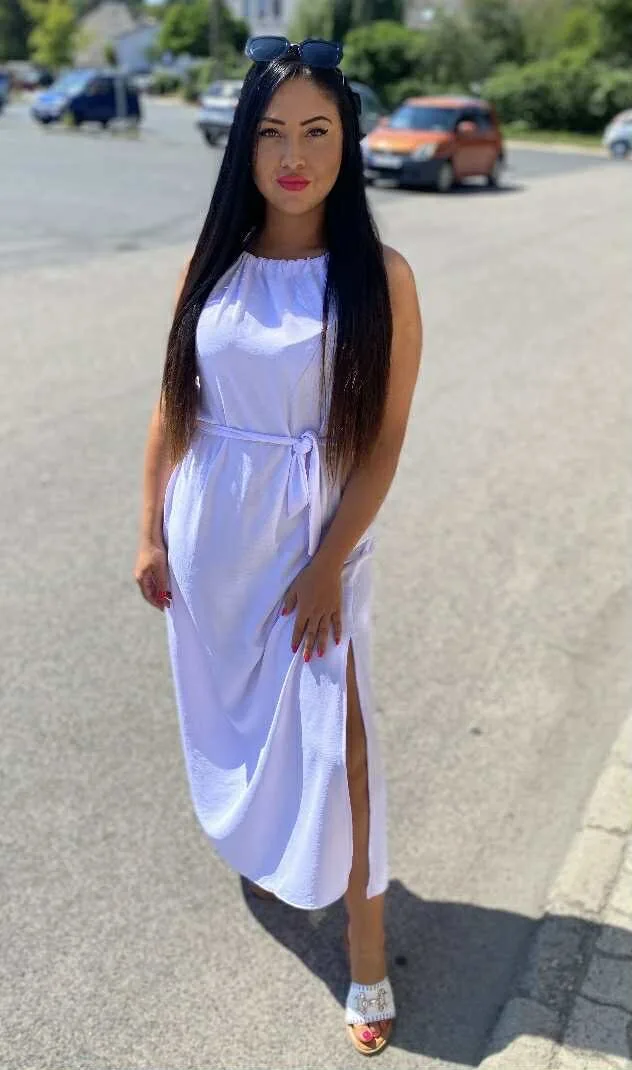 Enyhén elasztikus krepp anyagból készült vállán megkötős, lezser szabásvonalú maxi ruha, alján slicceléssel, kis fém márkajelzéssel.