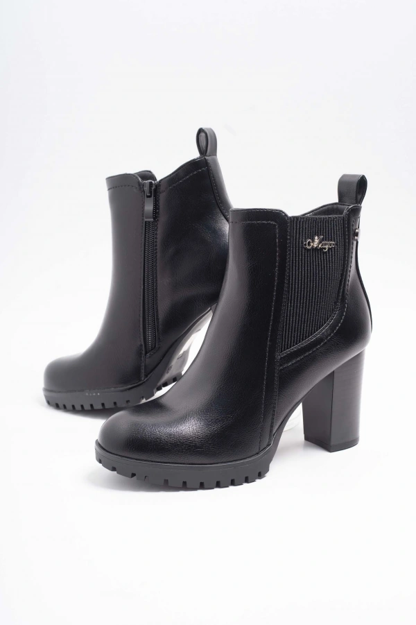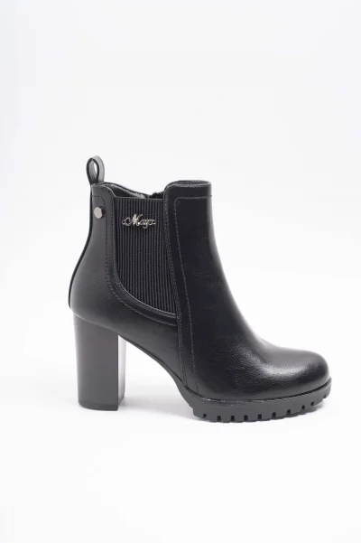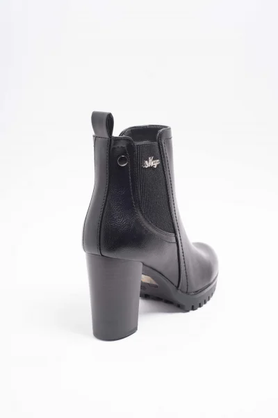 Műbőrből készült magassarkú bokacsizma gumis betéttel, cippzáras záródással, fém díszítéssel és márkajelzéssel.