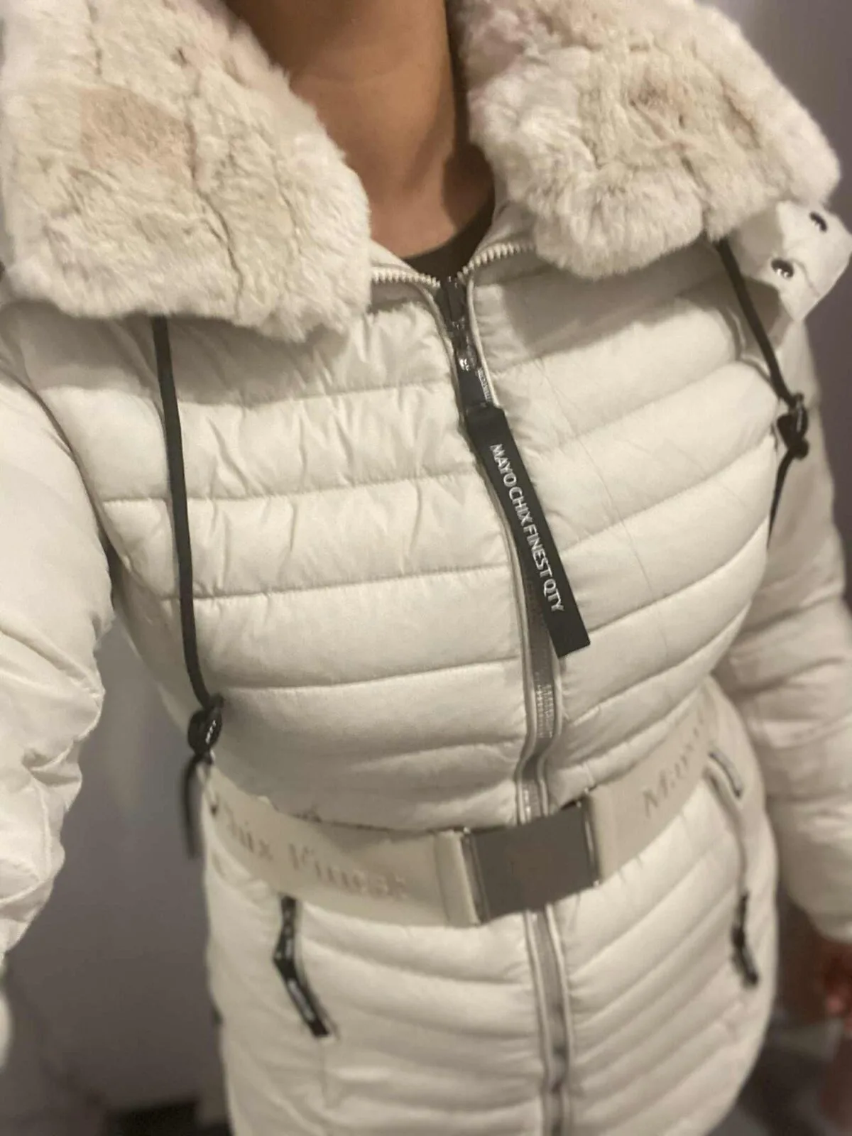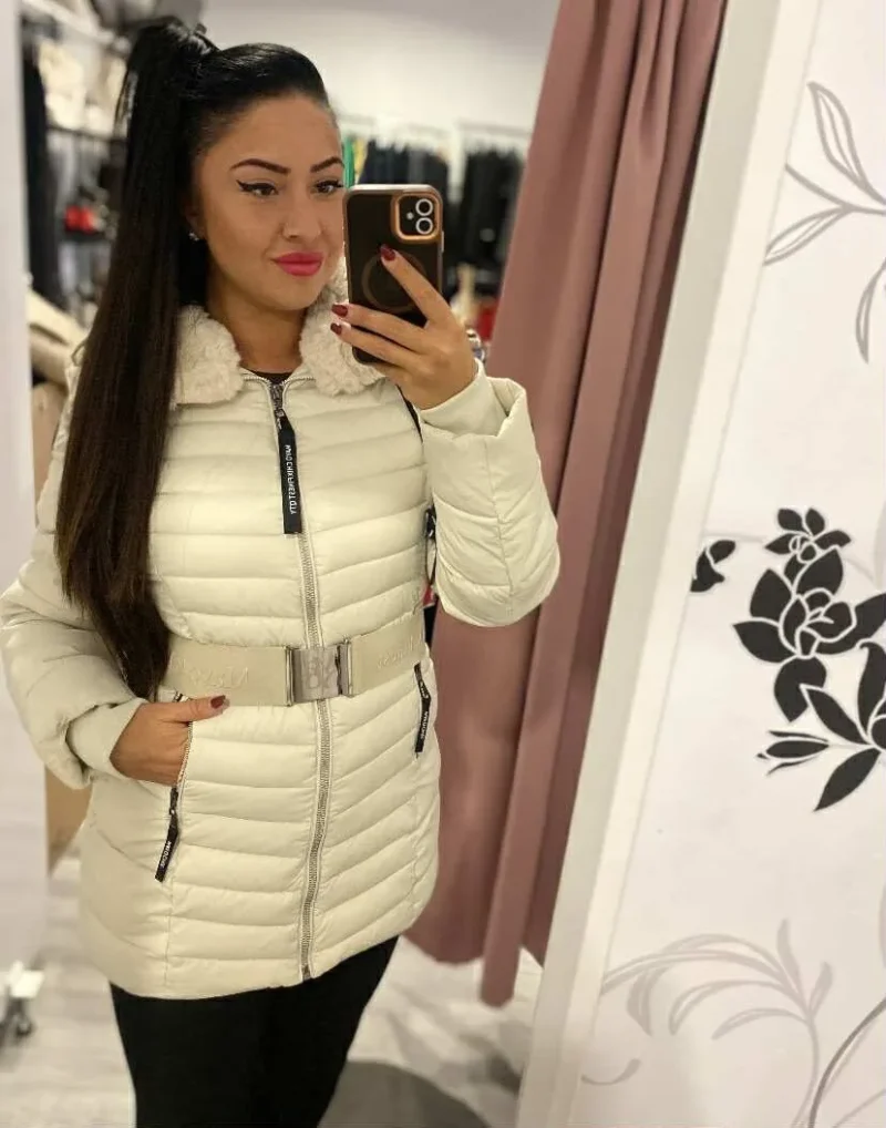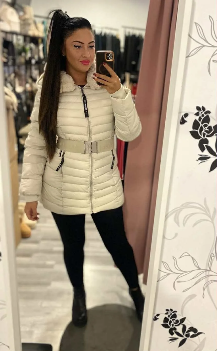 Karcsúsított fazonú steppelt, öves kabát, lecippzárazható kapucnival, legombolható igazszőrmével, applikált márkajelzéssel.