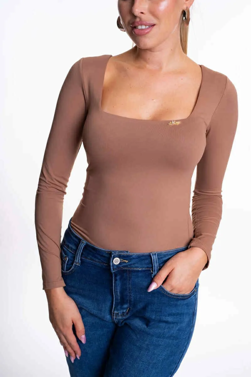Elasztikus anyagból készült, karcsúsított fazonú felső, mellrészen bélelővel, kis fém márkajelzéssel.