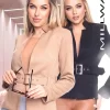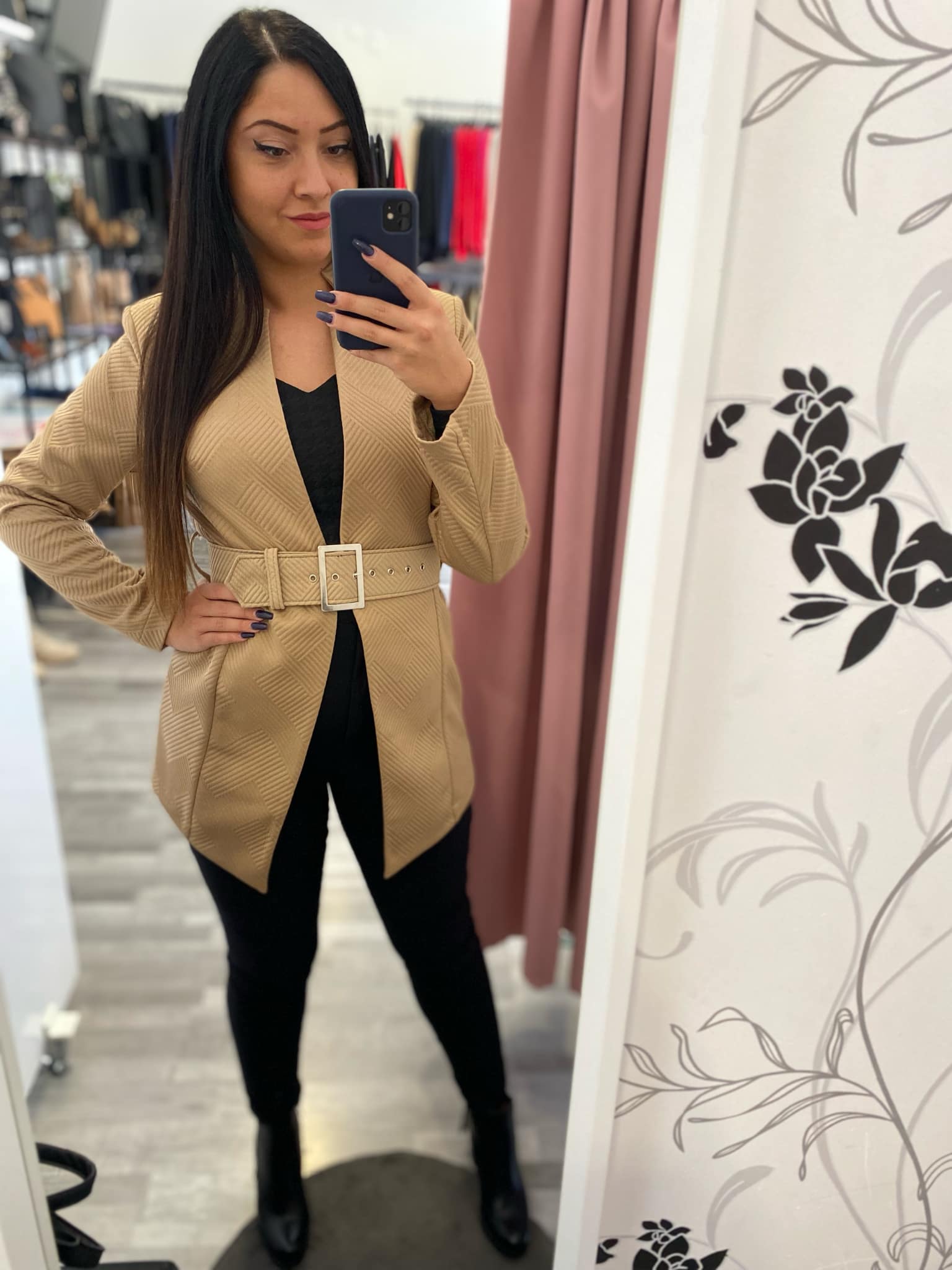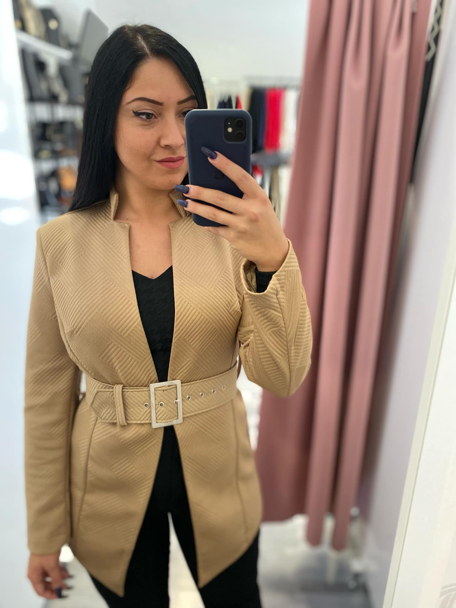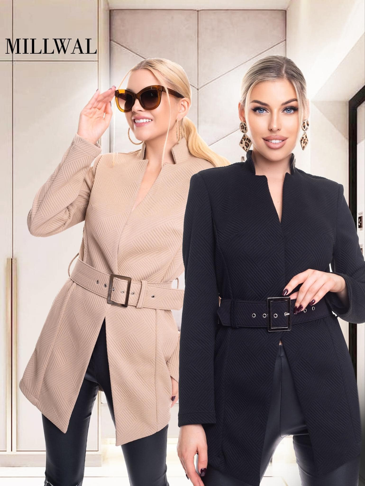 Fix, mintás felületű anyagból készült blézer válltöméssel, saját anyagából készült öv kiegészítővel, kis fém márkajelzéssel.