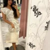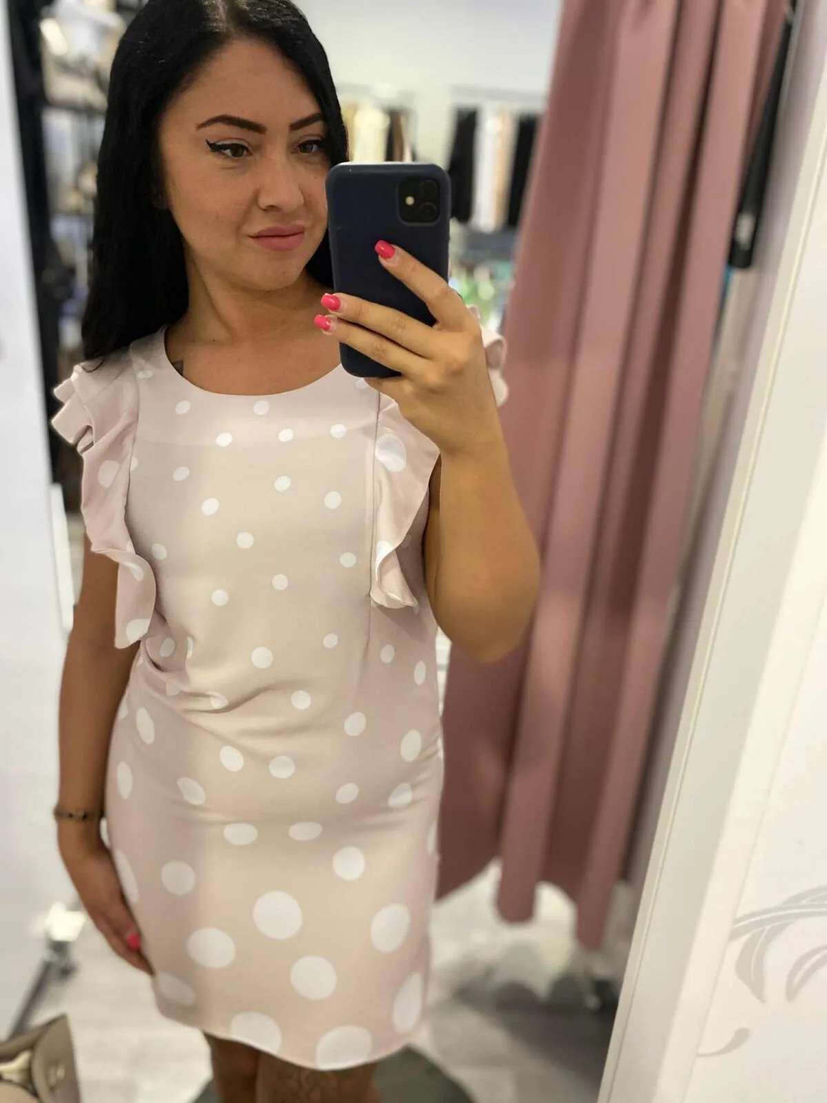 Fix anyagból készült ruha, fodros díszitéssel, hátán megkötővel.