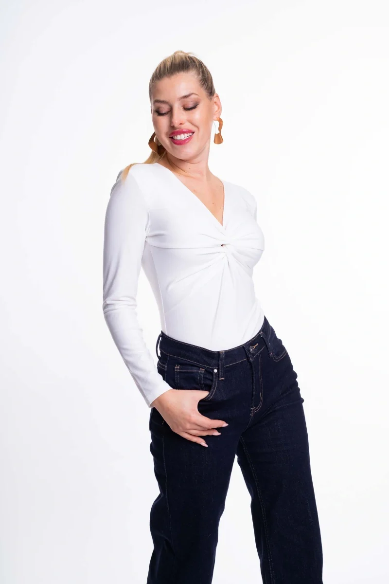 Elasztikus anyagból készült felső, mellrészen csavart megoldással, kis fém márkajelzéssel.