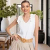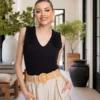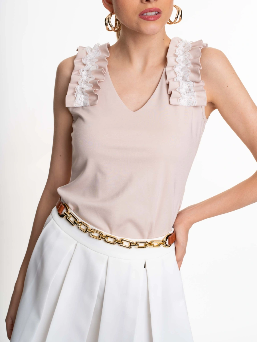 Elasztikus anyagból készült, csipkével kombinált felső, kis fém márkajelzéssel.