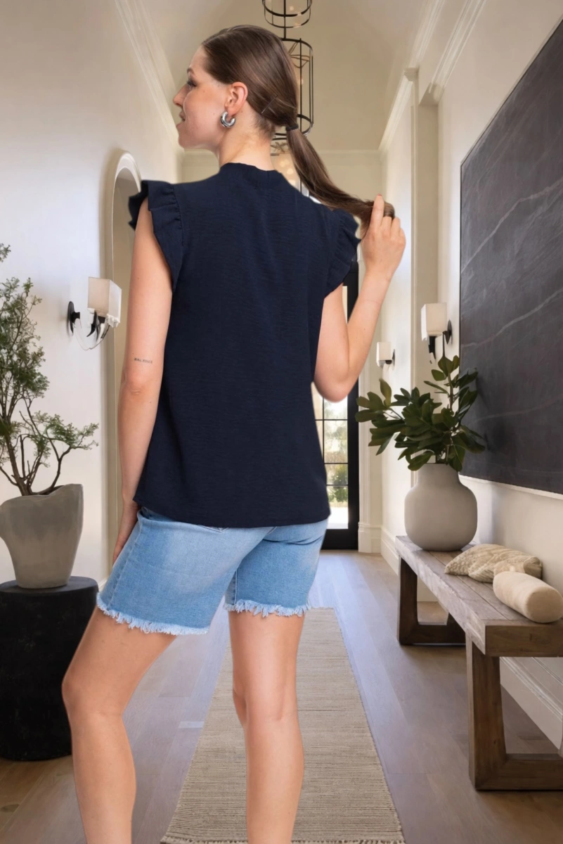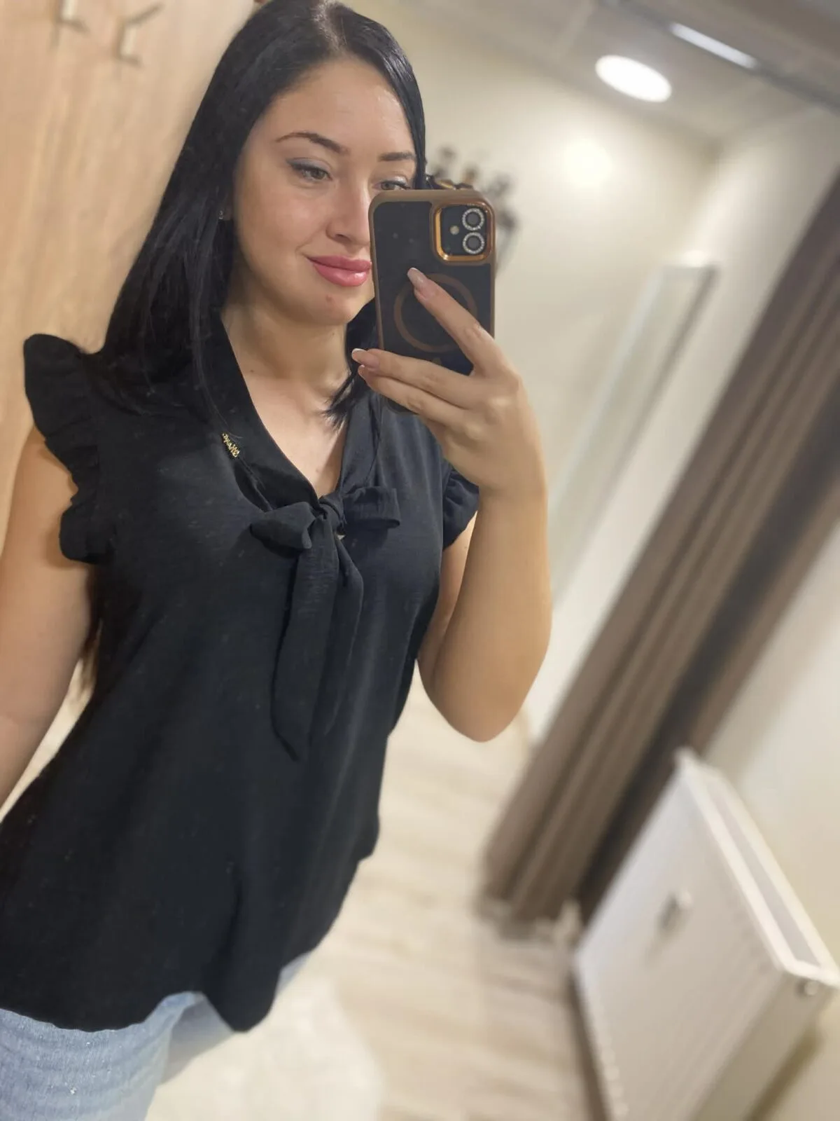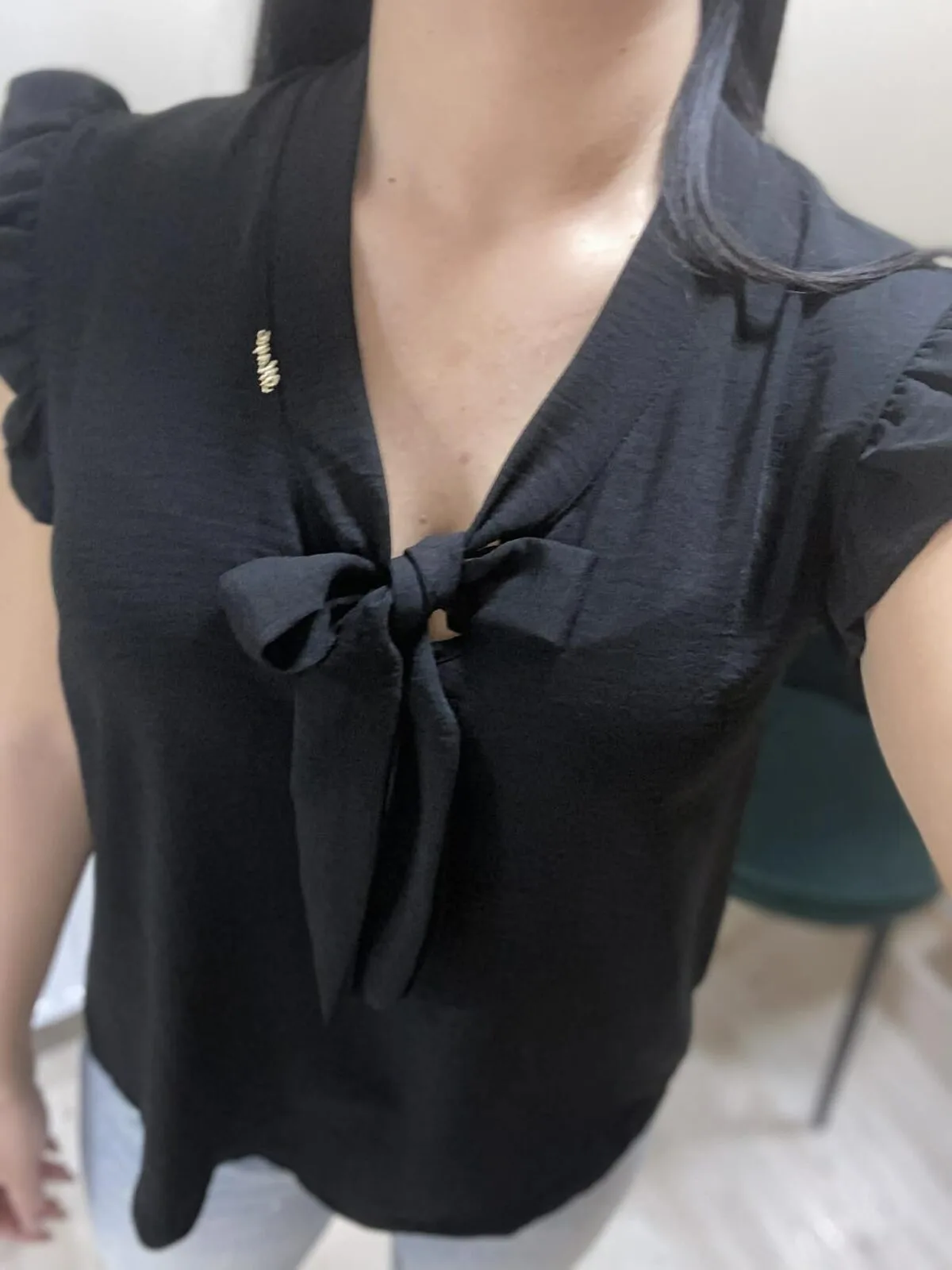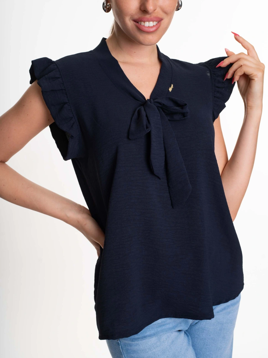 Enyhén elasztikus krepp anyagból készült, lezser szabásvonalú blúz, fodros ujjarésszel, nyakán masnis megkötővel, kis fém márkajelzéssel.