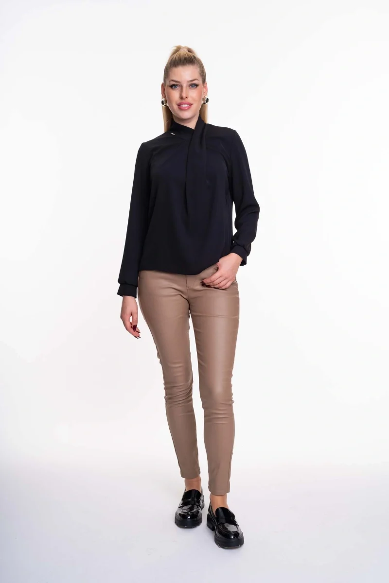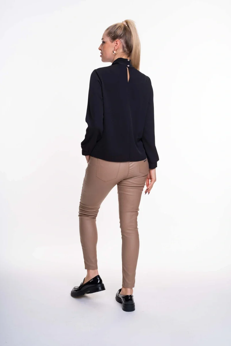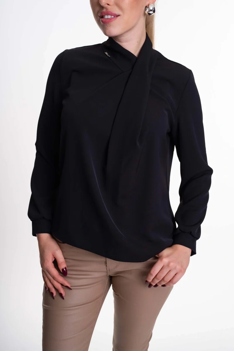 Enyhén elasztikus anyagú, lezser szabásvonalú blúz, elegáns hajtással készült nyakrésszel, kis fém márkajelzéssel.
