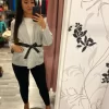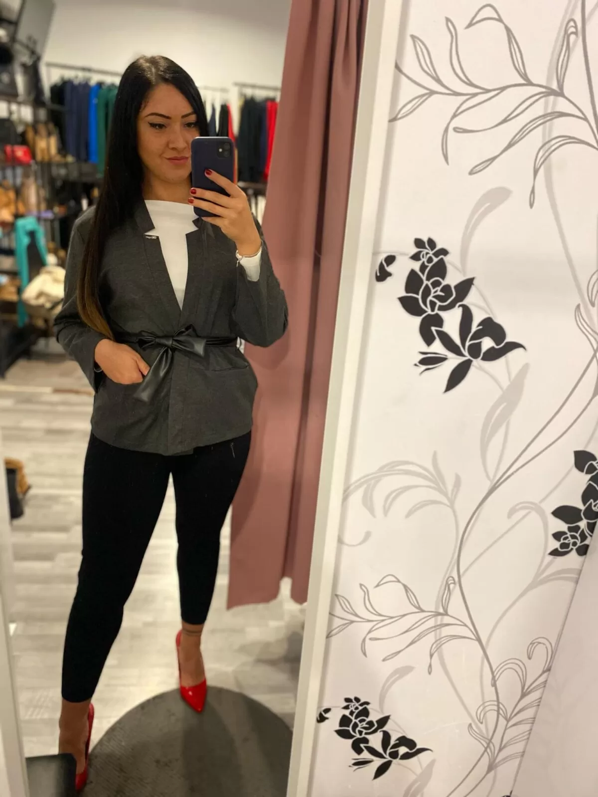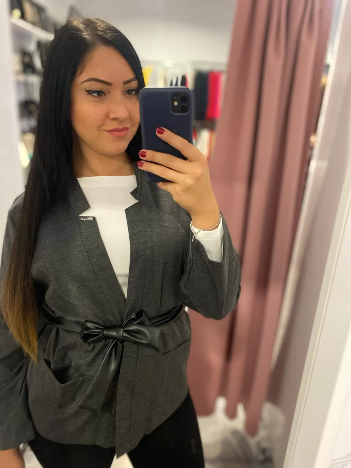 Elasztikus anyagból készült hosszított fazonú, nyitott blézer, rejtett zsebekkel, derekán műbőrből készült megkötős öv kiegészítővel, kis fém márkajelzéssel.