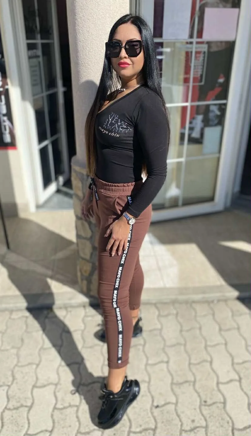 Elasztikus anyagból készült sportos fazonú felső, márkajelzéssel díszítéssel.