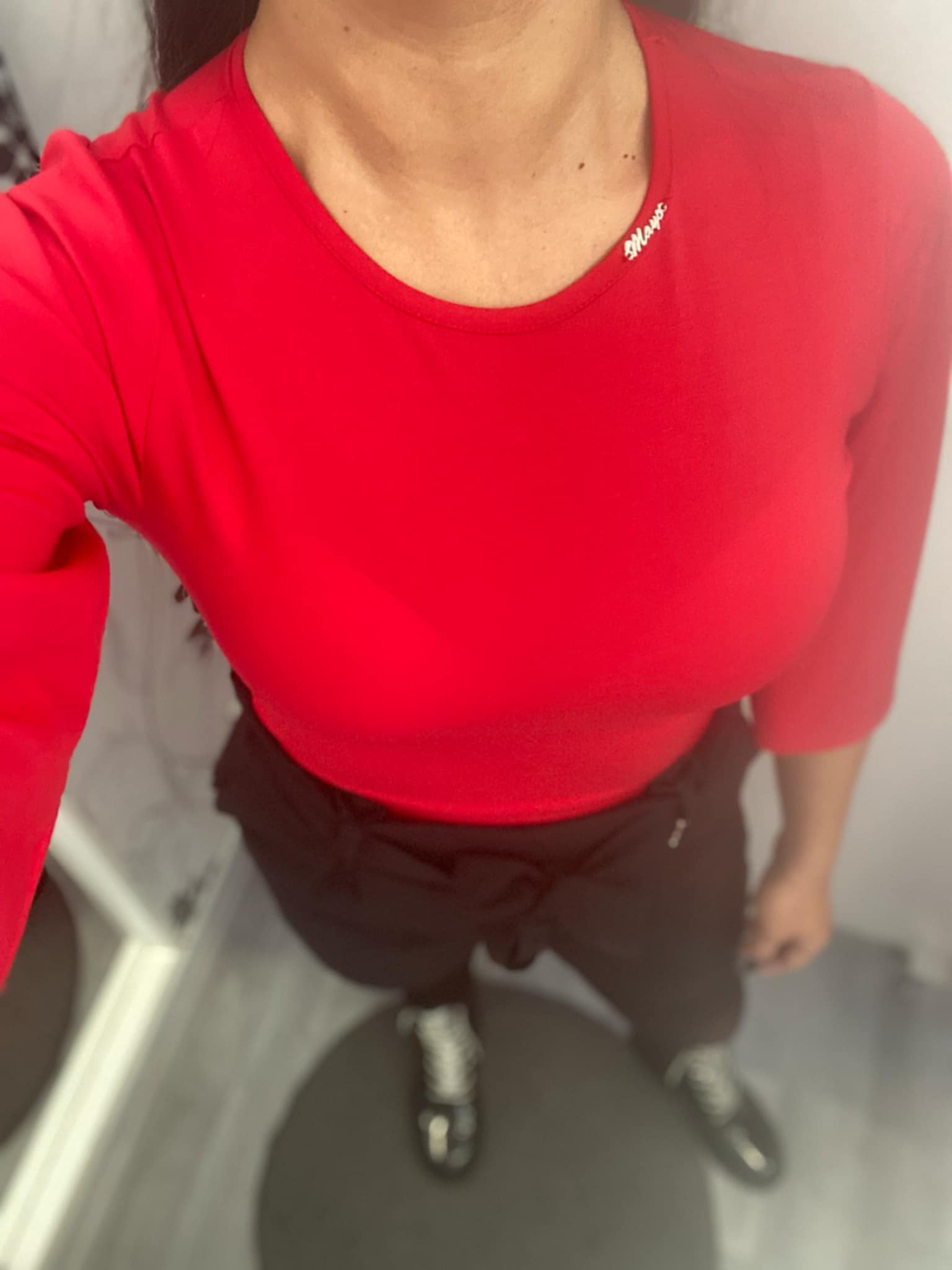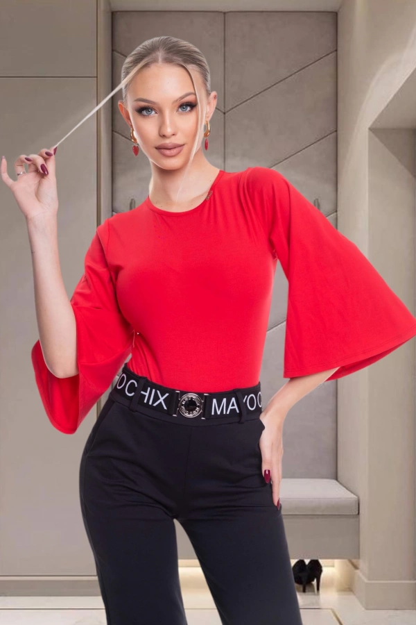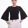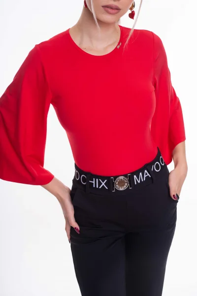 Elasztikus anyagból készült karcsúsított fazonú body bő ujjakkal, kis fém márkajelzéssel.