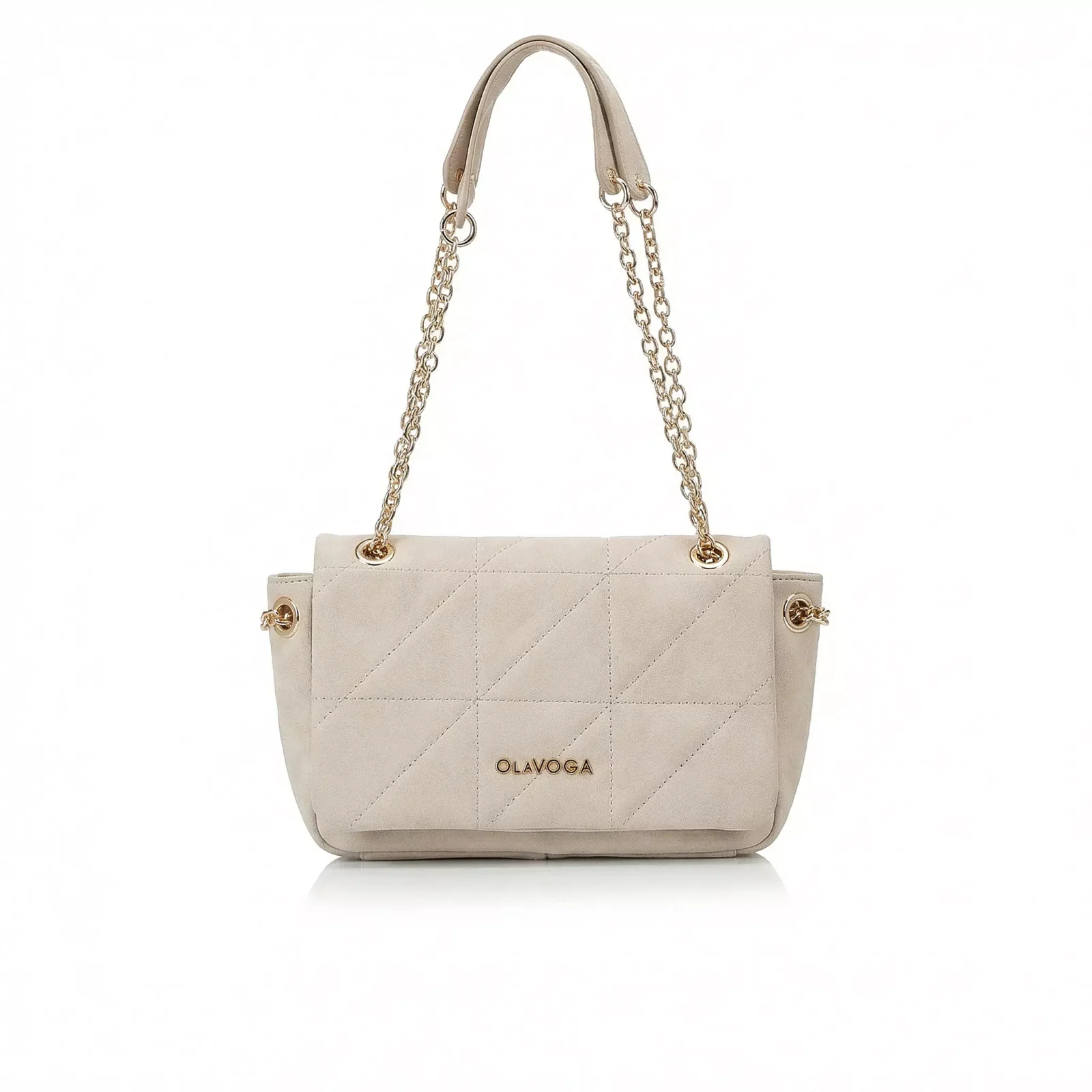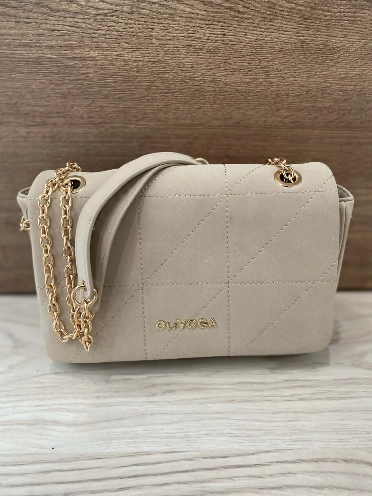 Stílusos válltáska steppelt anyagból, merevített kialakítással és fedeles záródással. Arany színű fém láncpánttal készült, a pánton dombornyomott OLAVOGA logóval. Az elején fém logó részlet díszíti, mágneses záródással a praktikus használat érdekében.