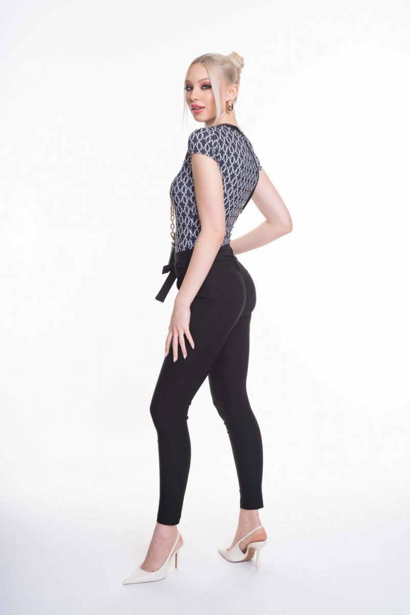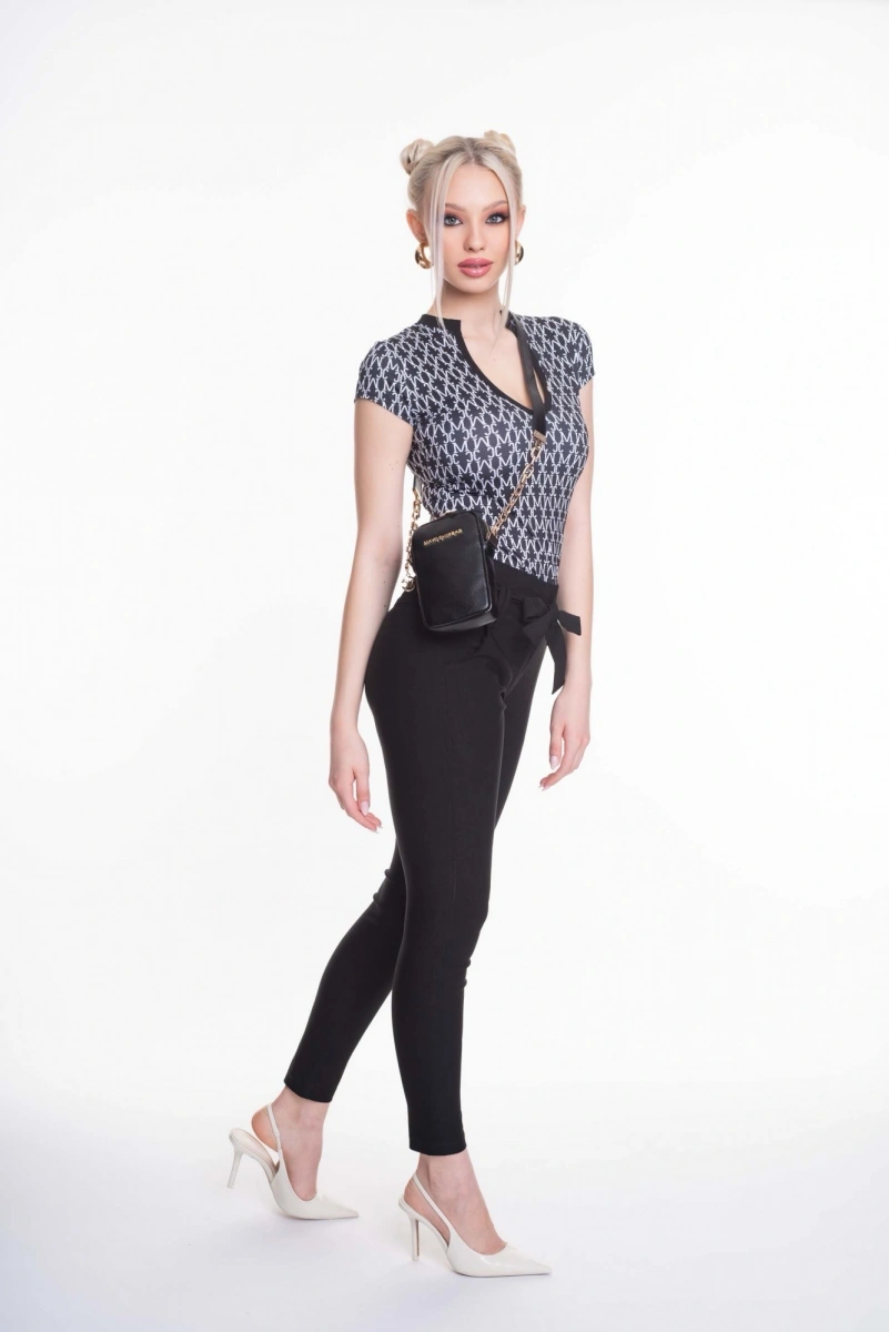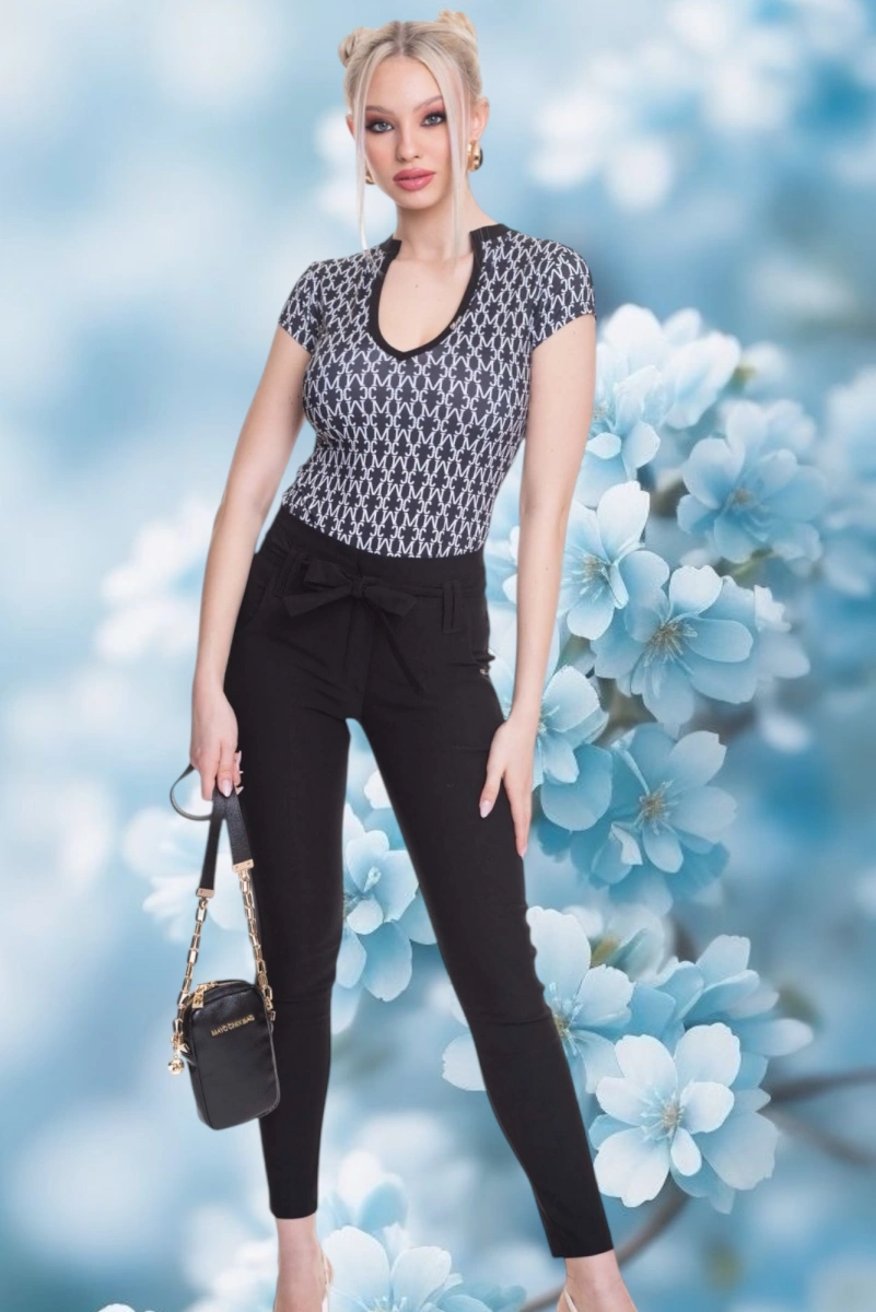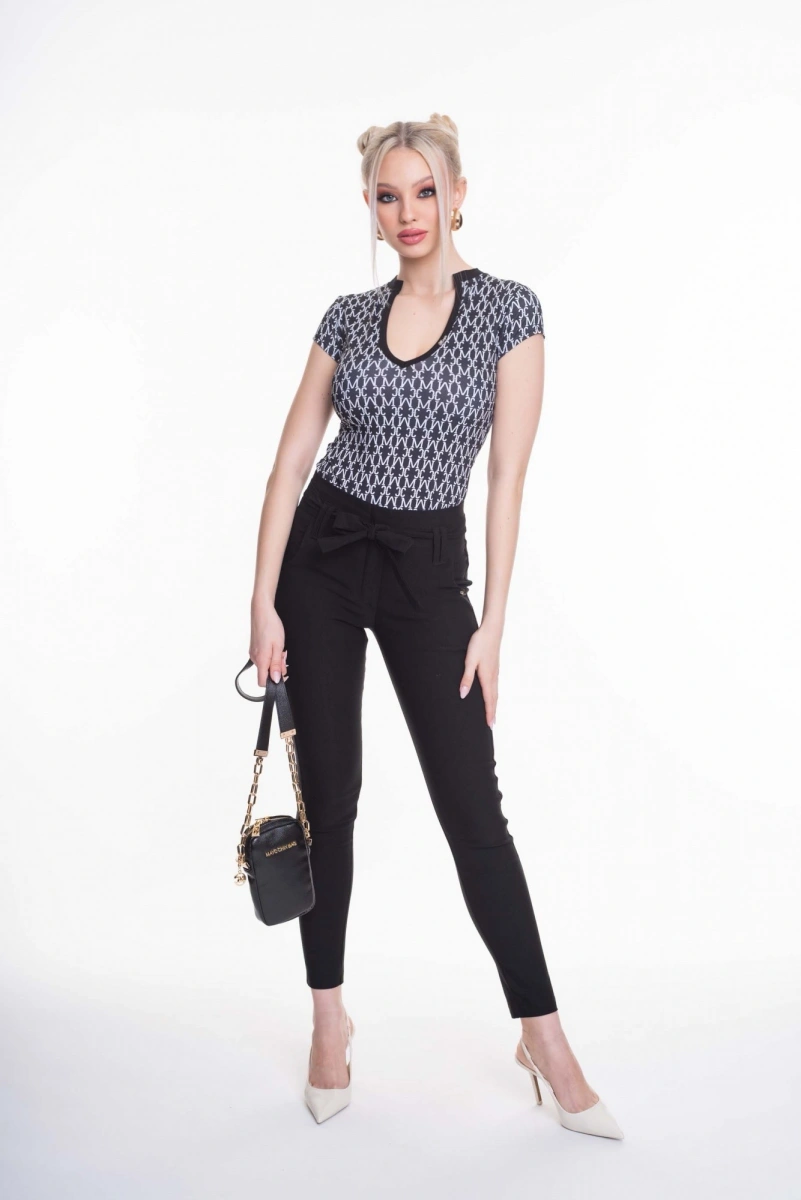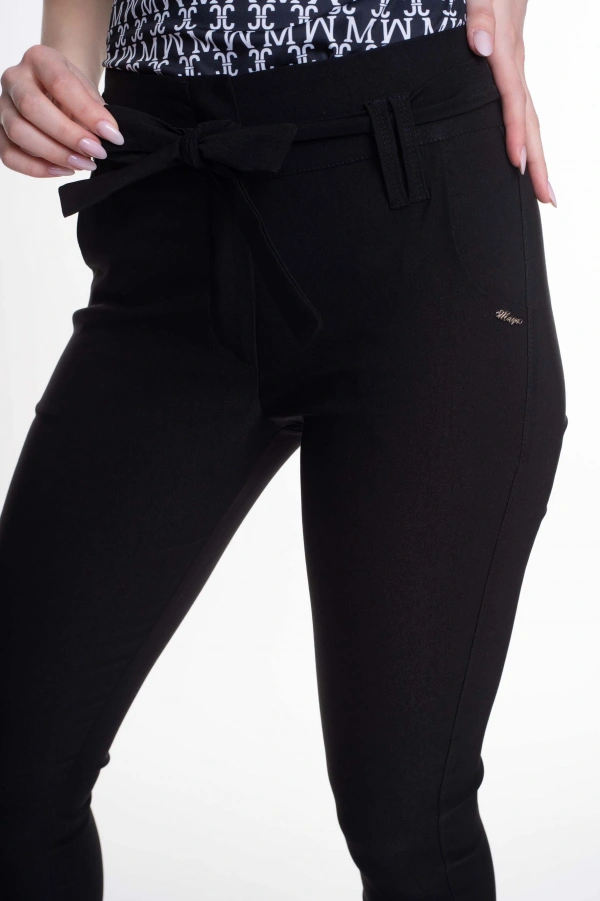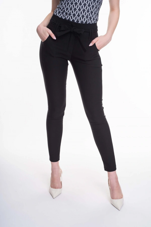 Elasztikus anyagból készült szűk szárú, zsebes nadrág, saját anyagából készült megkötővel, kis fém márkajelzéssel.
