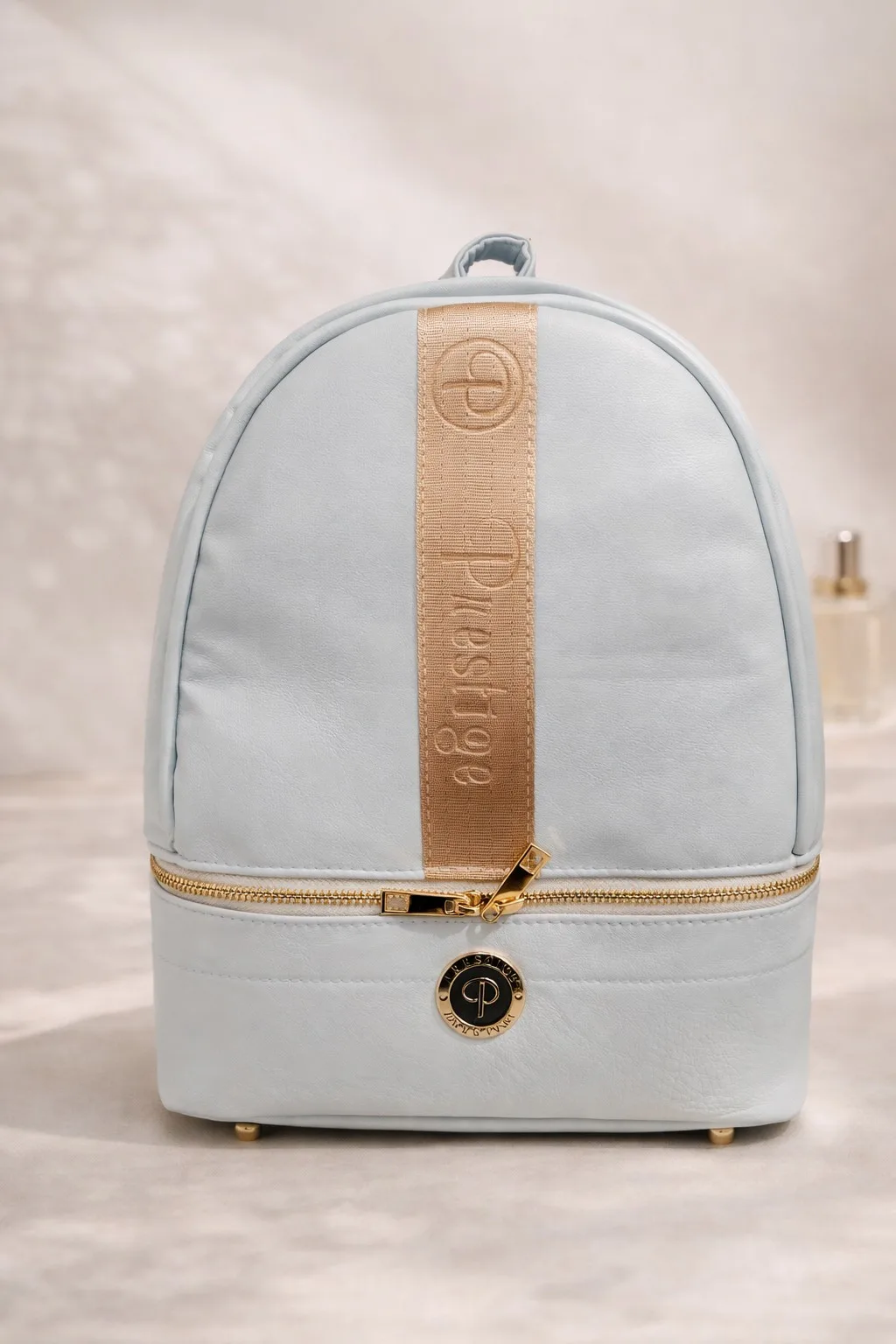 Világoskék női  műbőr hátizsák,cipzáros záródással. Belsejében egy  rekesszel, elején cipzáros zsebbel rendelkezik. Elején márkajelzett textílcsík díszítéssel
