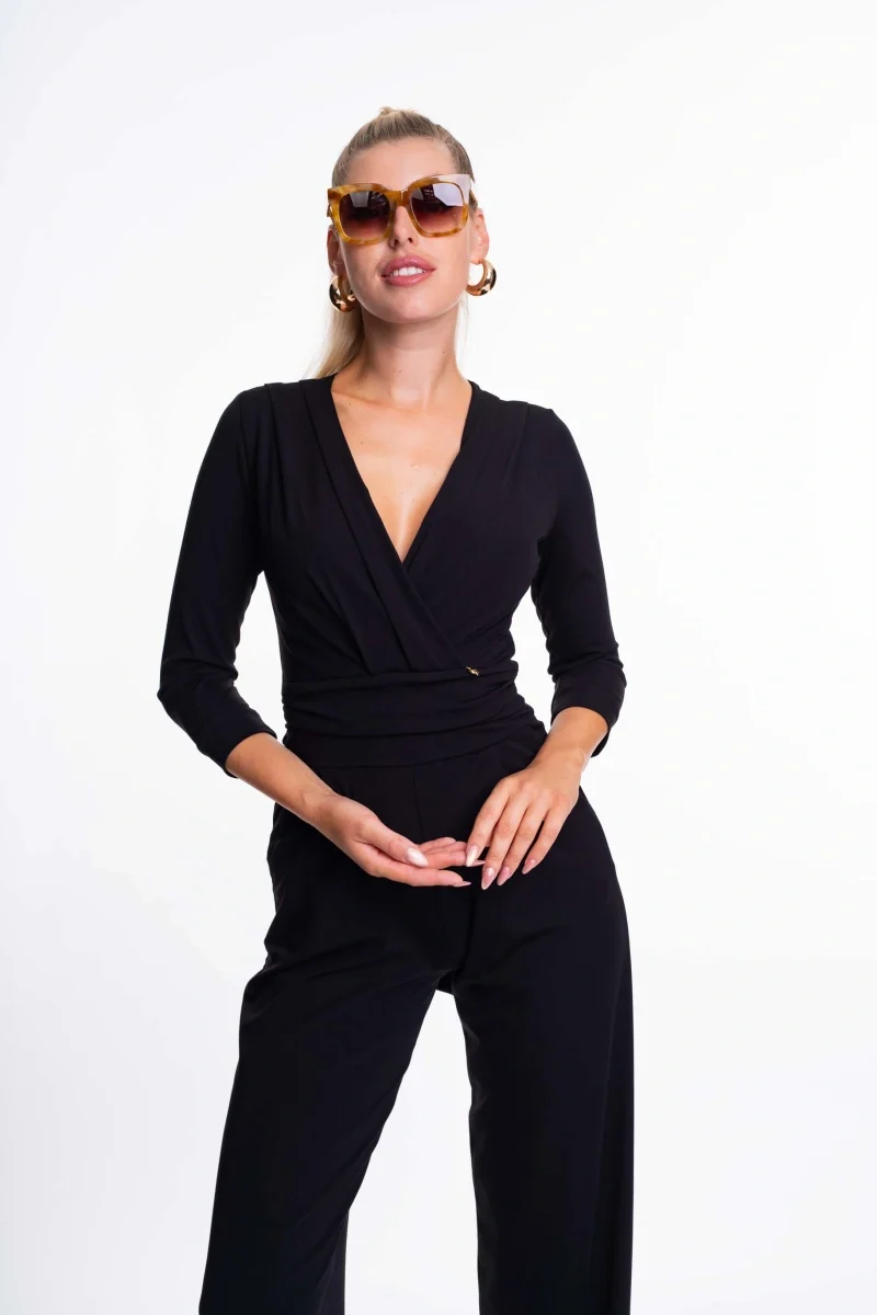 Elasztikus anyagból készült zsebes overall, megkötős derékrésszel, átlapolt mellrész megoldással, kis fém márkajelzéssel.