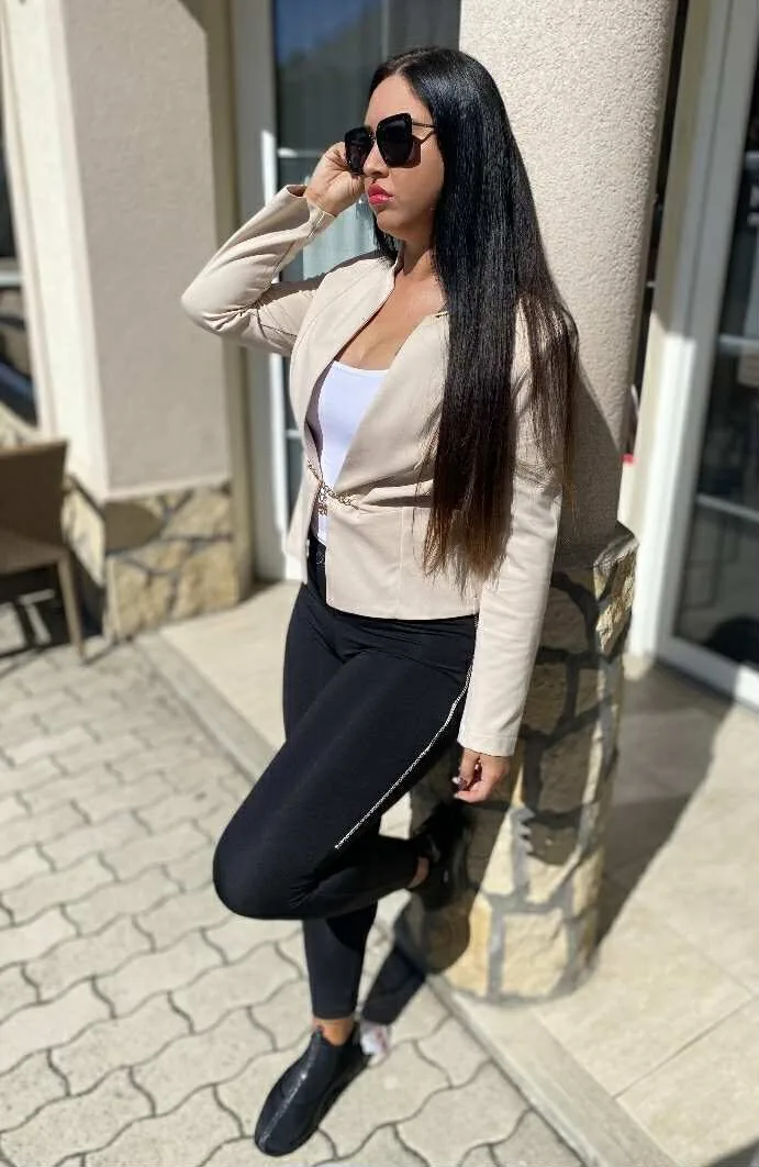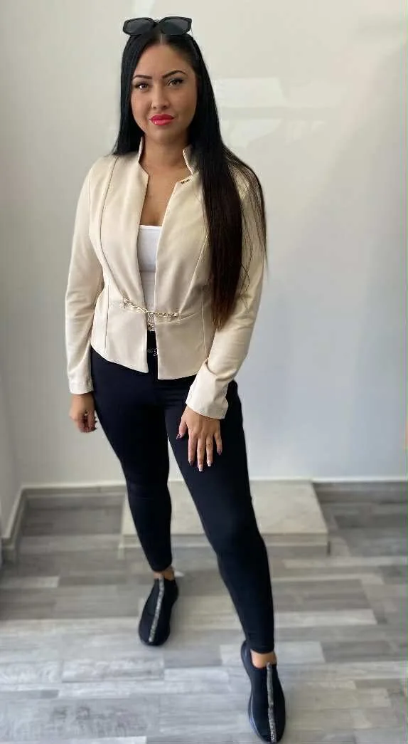 Elasztikus anyagból készült, karcsúsított fazonú blézer láncos záródással, kis fém márkajelzéssel.